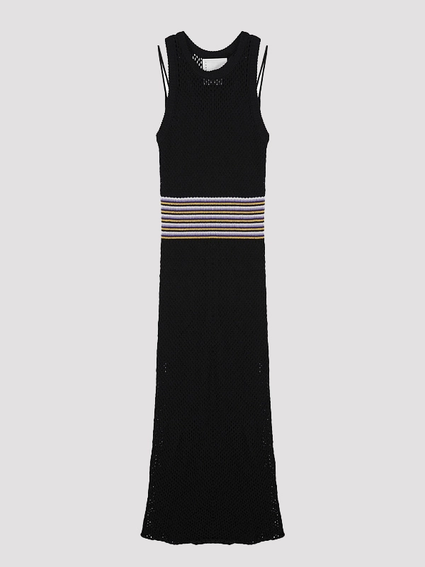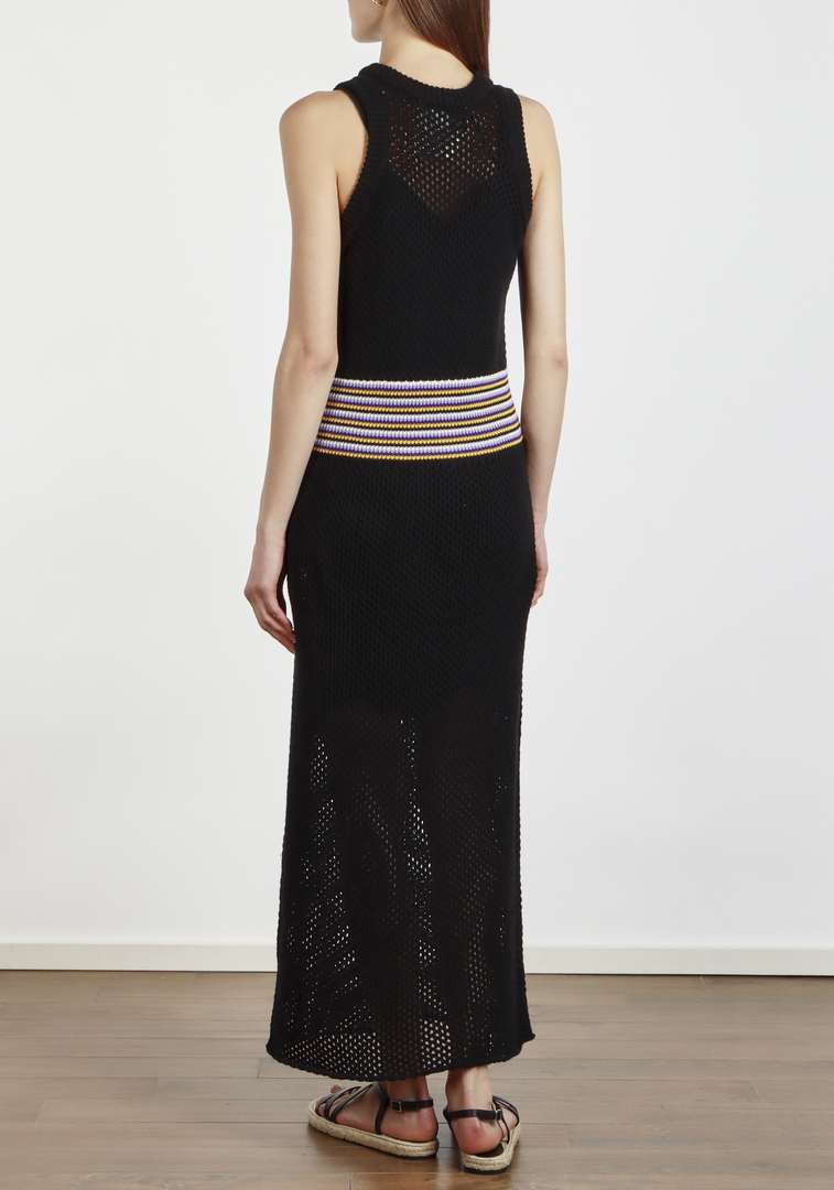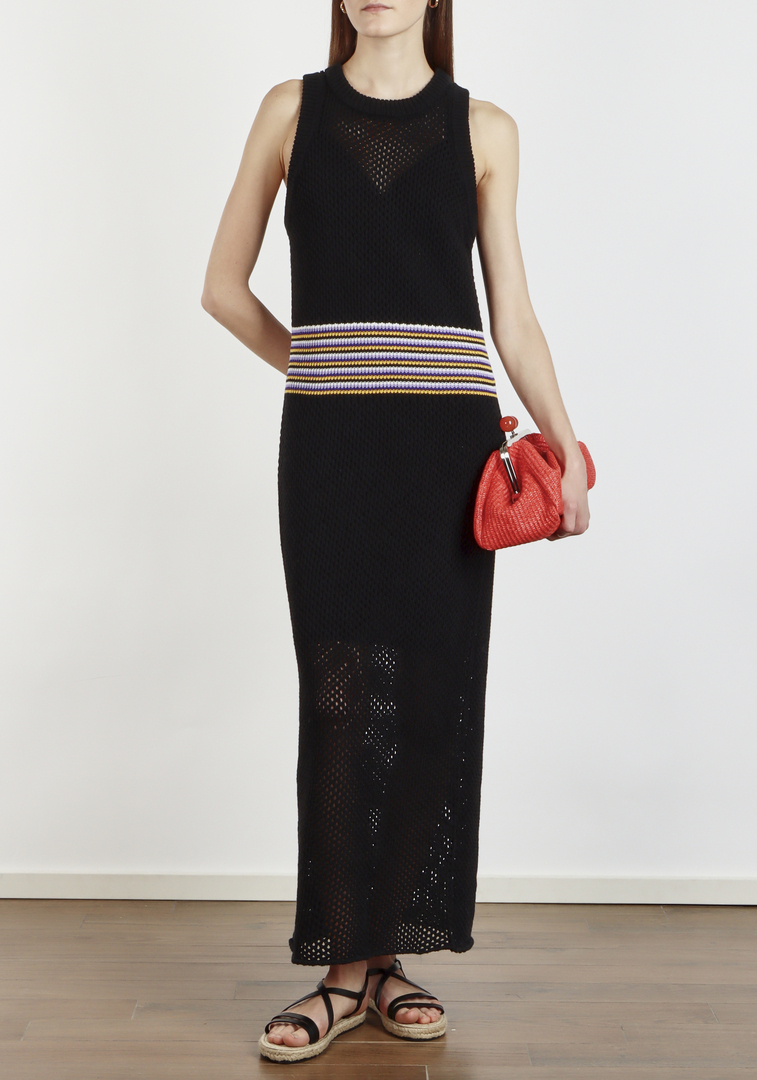 Платье 8PM, черное, выполнено из смеси хлопка и акрила (50% каждого). Тонкая вязаная фактура придает модели элегантность и лаконичность. Декорировано контрастной отделкой по талии, добавляющей выразительности. Свободный крой с открытыми плечами создает непринужденный силуэт, подходящий для любого случая.