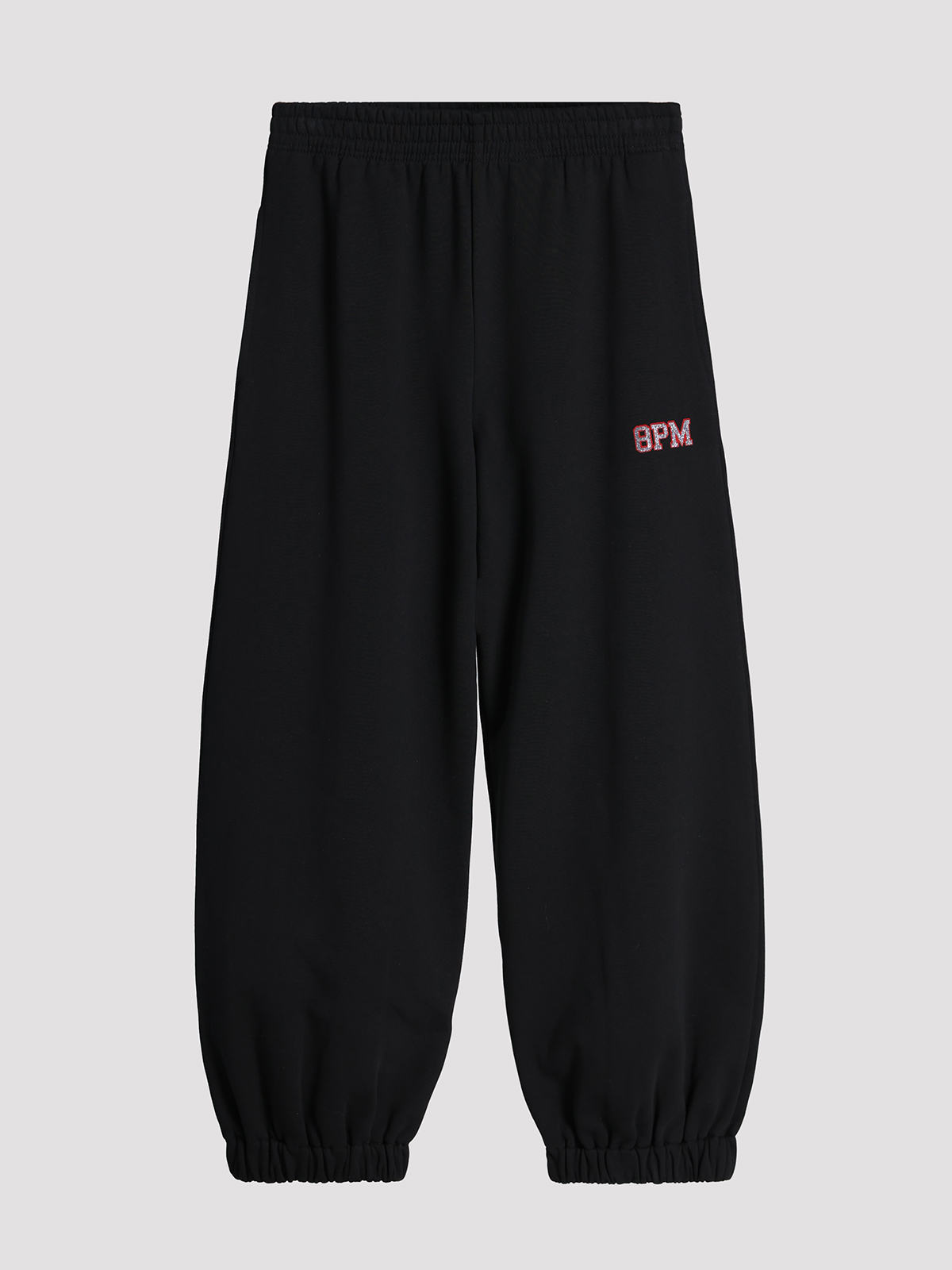 Брюки спортивные 8PM выполнены из 100% хлопка, что обеспечивает комфорт и мягкость. Изделие черного цвета с лаконичной отделкой — вышитым логотипом бренда на боковом шве. Прямой крой и эластичный пояс создают современный и универсальный силуэт, подходящий для повседневного стиля. Текстура ткани гладкая, с легким блеском, подчеркивающим качество материала.