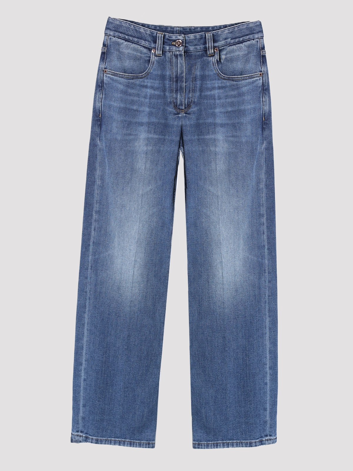Джинсы Brunello Cucinelli выполнены из мягкой смеси хлопка и эластана, что обеспечивает комфорт и идеальную посадку. Синий оттенок с эффектом потертости придает изделию непринужденный шарм, а классический прямой крой подчеркивает элегантность. Детали в виде контрастной строчки и фирменной пуговицы завершают образ, делая его универсальным для повседневного стиля.