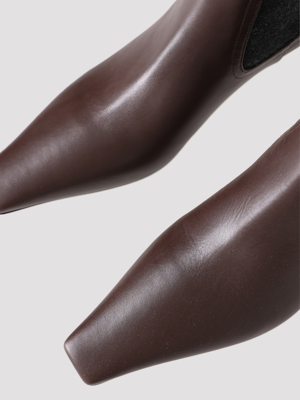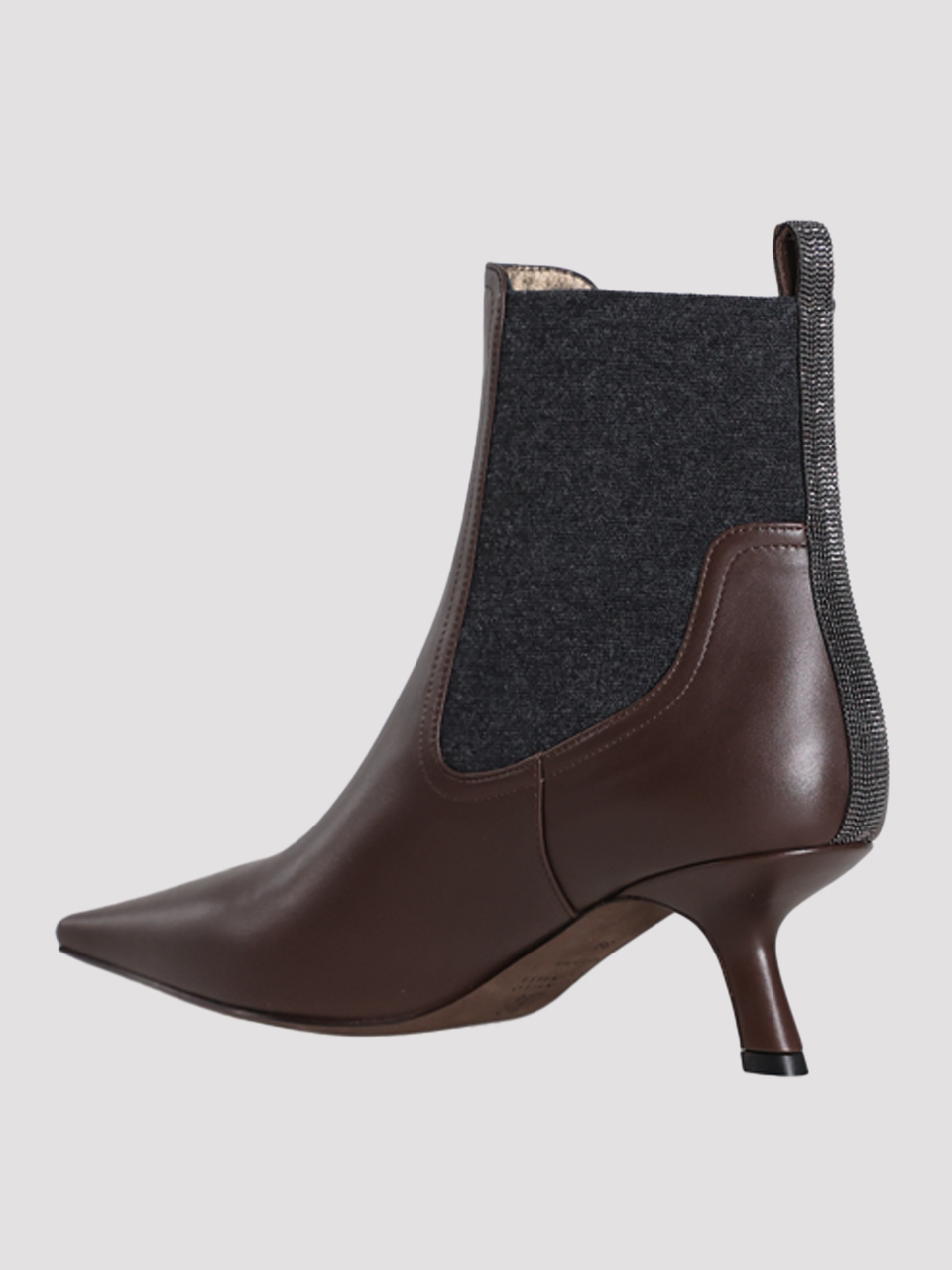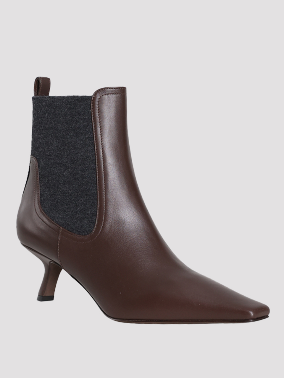 Ботильоны Brunello Cucinelli выполнены из гладкой коричневой кожи с эластичной вставкой из фетра, подчеркивающей современный и элегантный силуэт. Изделие дополнено тонкой подошвой из полиуретана, обеспечивающей комфорт и изысканный вид. Классический крой и минималистичная отделка делают их идеальным выбором для стильных образов в духе вечной элегантности.