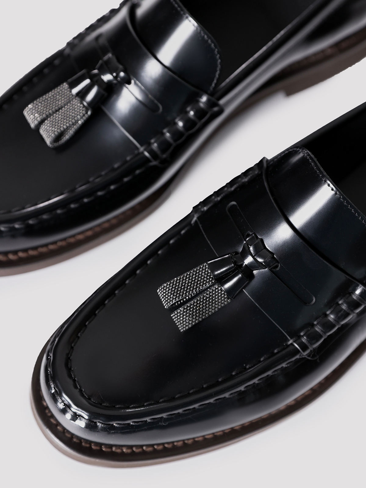 Лоферы из гладкой черной кожи от Brunello Cucinelli — воплощение безупречного стиля и классической элегантности. Изделие выполнено из натуральной кожи с тонкой текстурой, подчеркивающей качество материала. Декоративная отделка в виде небольшого ремешка с пряжкой придает модели изысканный шарм. Классический крой обеспечивает комфорт и универсальность, делая лоферы идеальным выбором для сочетания с деловыми образами или повседневными нарядами.