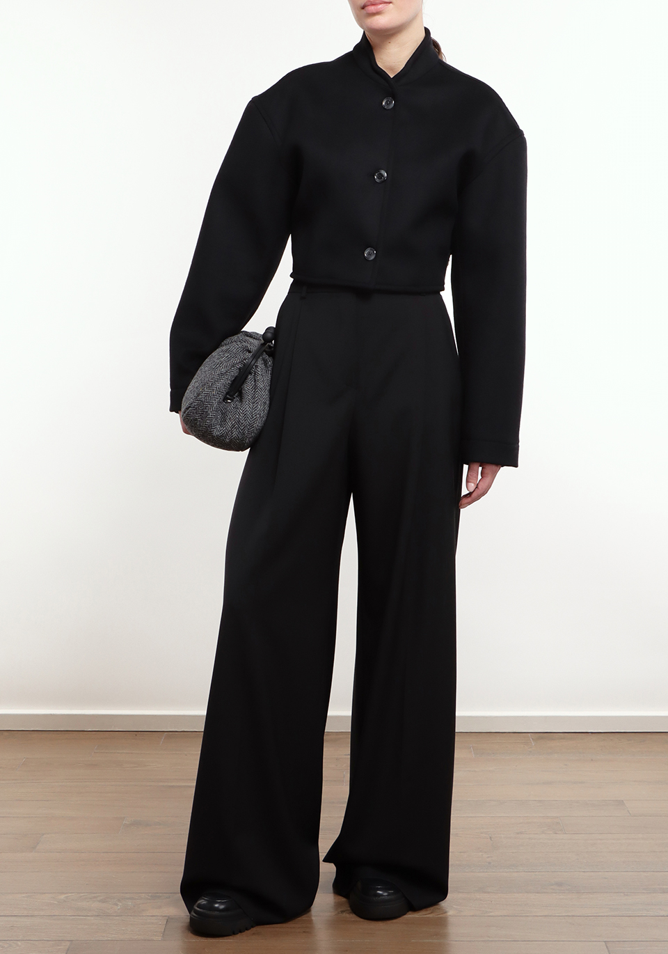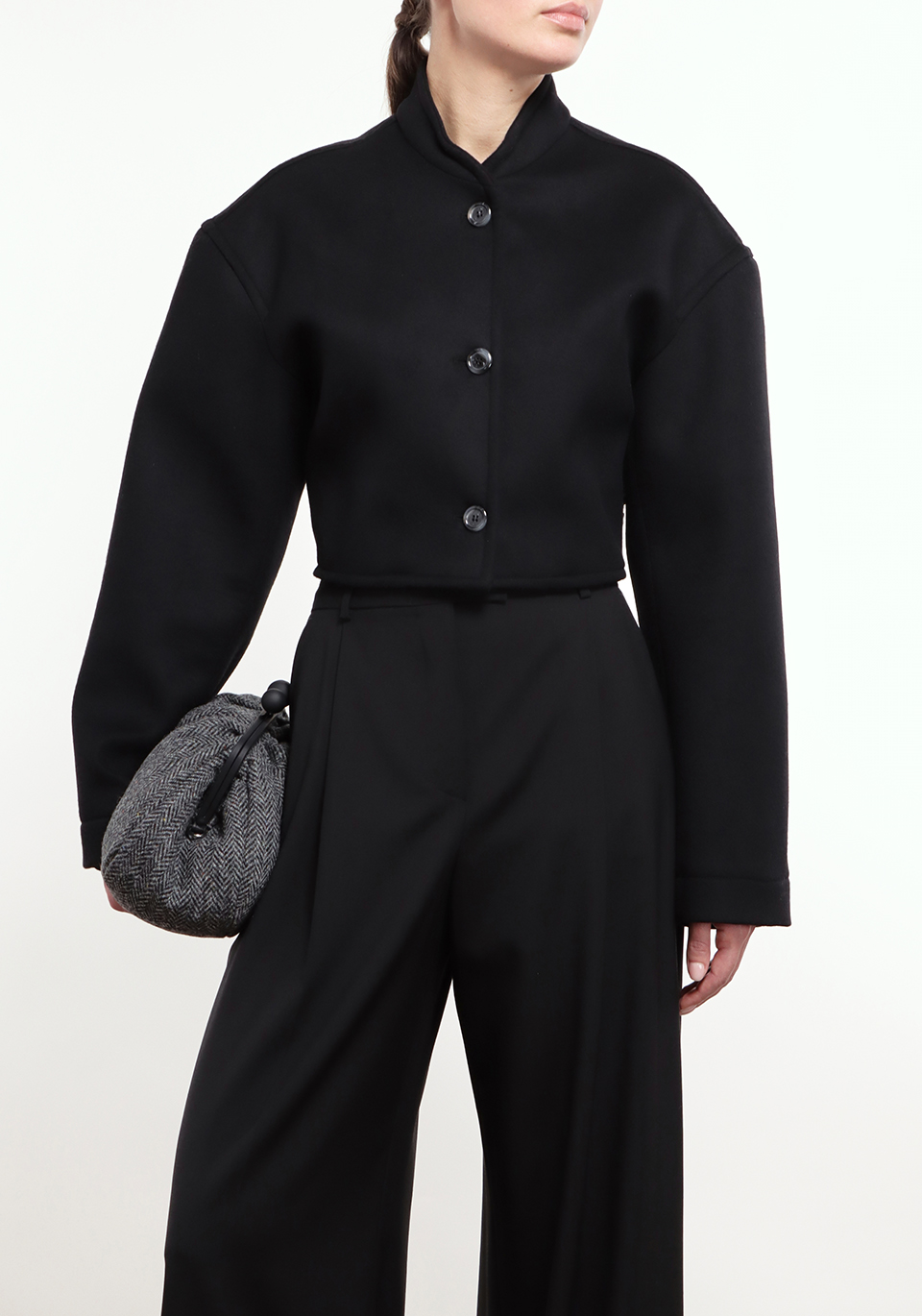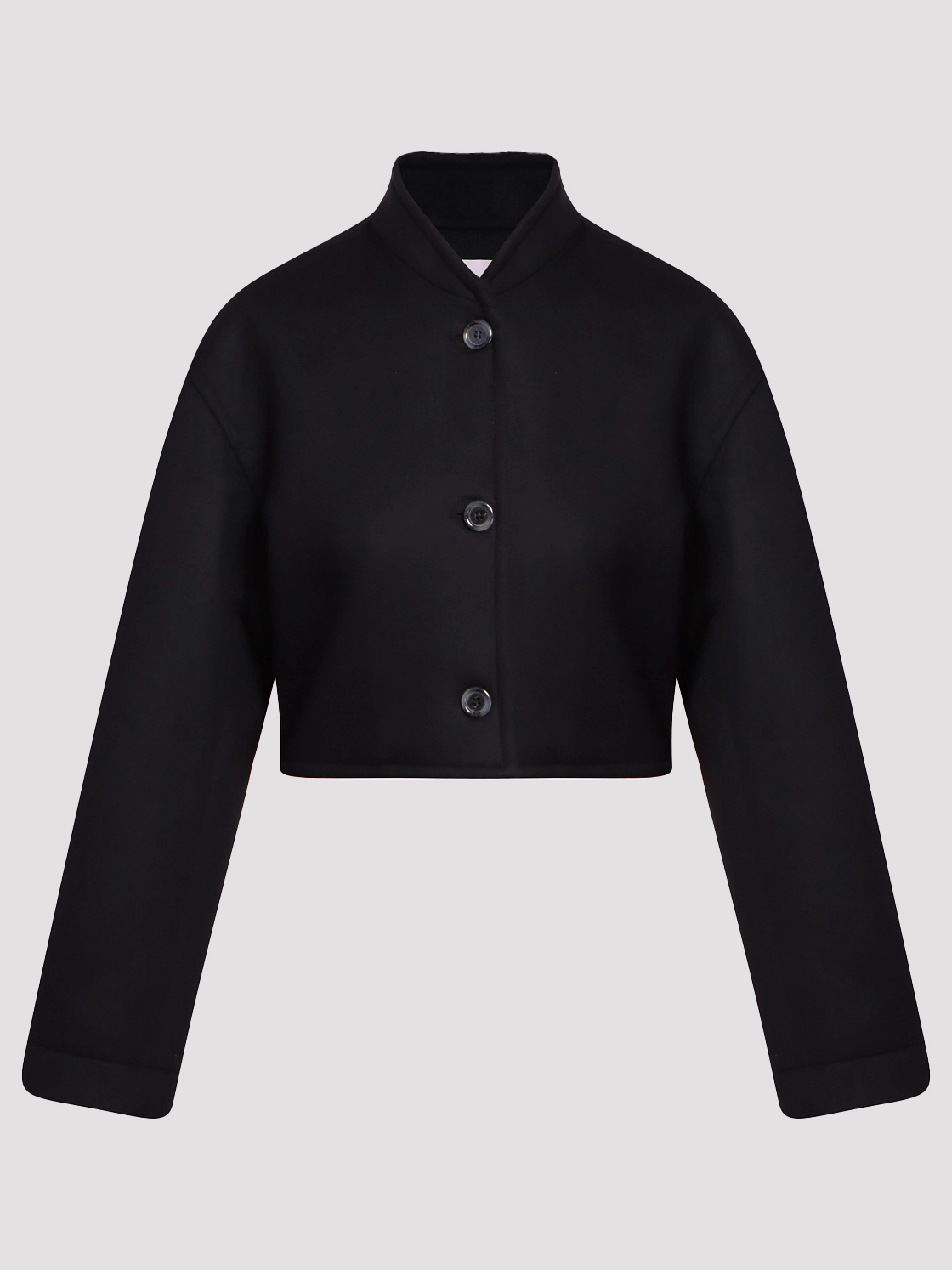 Пальто короткое Comeforbreakfast, черное, выполнено из 100% шерсти, обладает элегантной фактурой и лаконичной текстурой. Стильное пальто в тренде осени-зимы, его крой и силуэт подчеркивают современный минимализм с элементами роскоши. Отделка простая, но эффектная, декорировано металлическими пуговицами, что добавляет модели уникальности и выразительности.