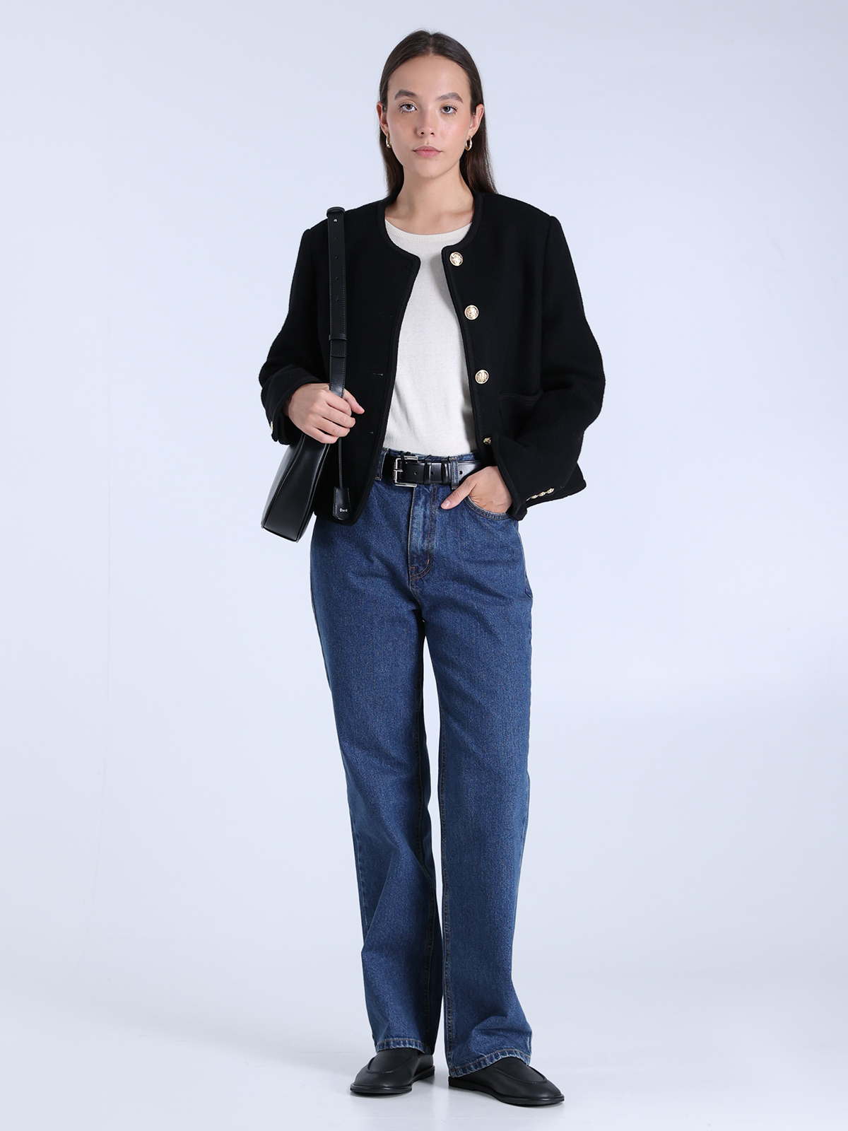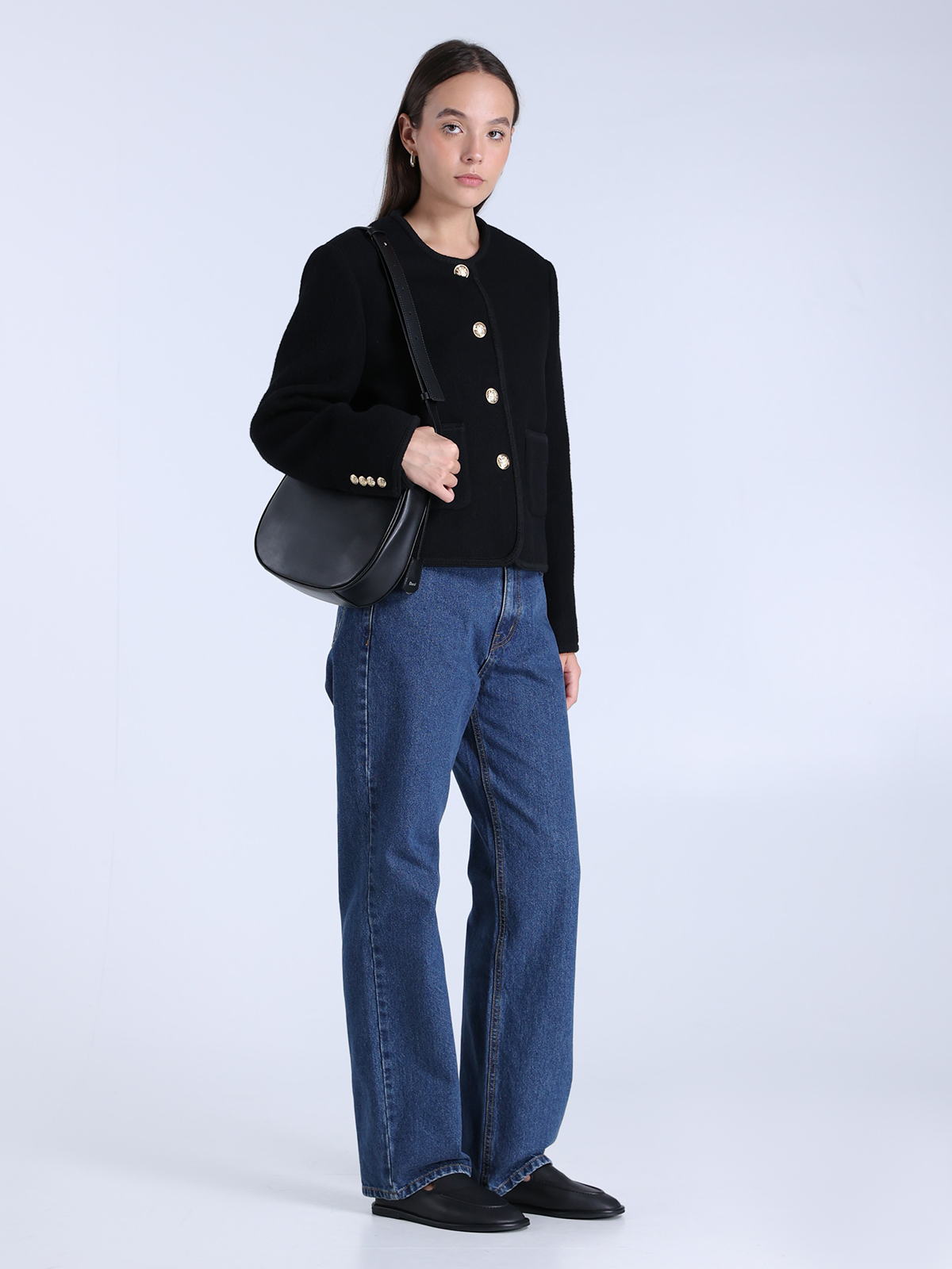 Жакет Dunst черного цвета, выполненный из 100% шерсти с гладкой текстурой, воплощает элегантность и минимализм. Классический крой с круглым вырезом и декоративными пуговицами золотистого оттенка подчеркивает современный стиль. Два накладных кармана завершают лаконичный силуэт, а подкладка из 100% полиэстера обеспечивает комфорт.
