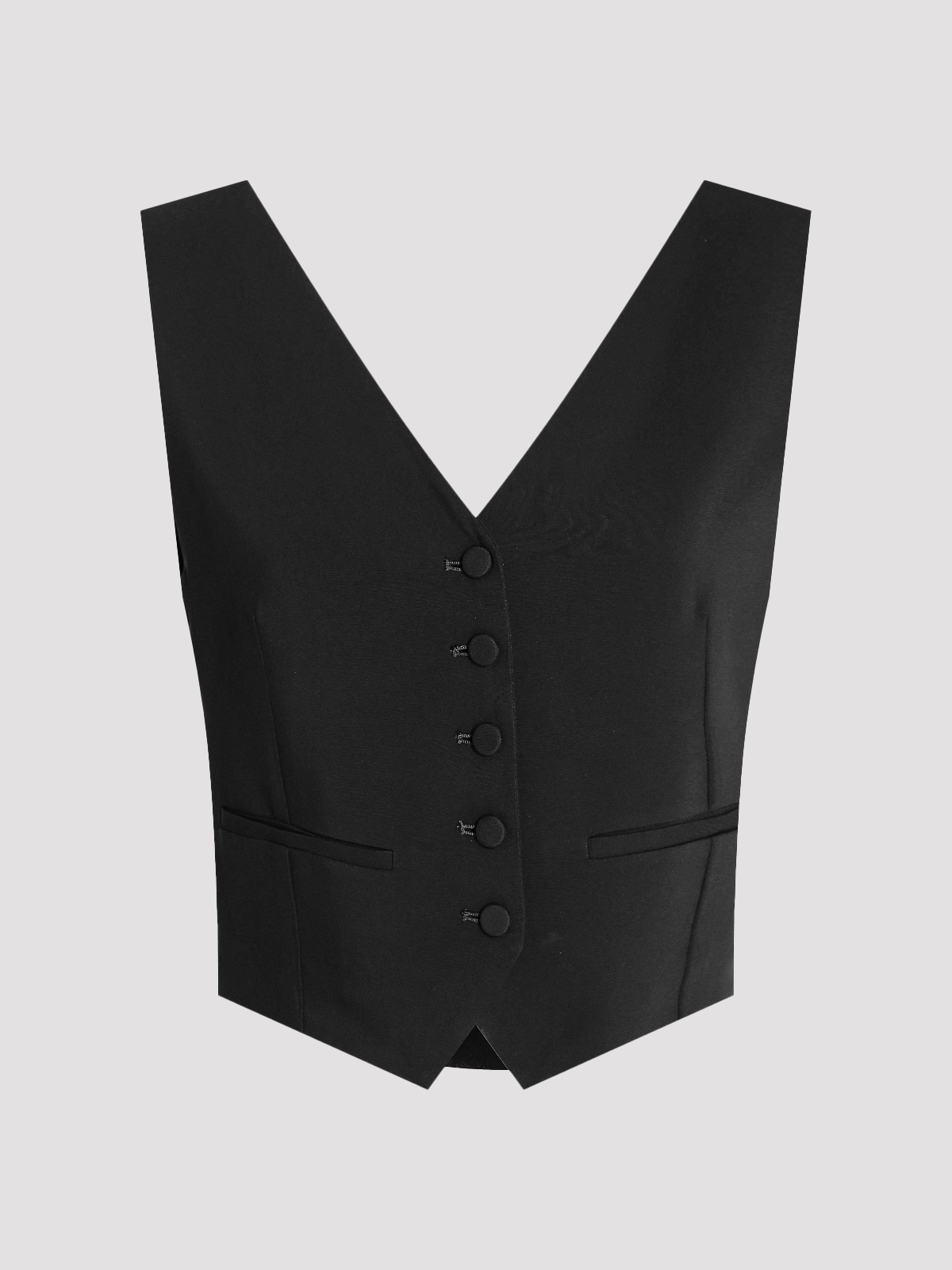 Жилет Erika Cavallini, выполненный из элегантной вискозы с добавлением эластана, создает идеальную основу для любого наряда. Черный цвет подчеркивает лаконичность и универсальность модели, а фактура ткани придает жилету шелковистость и мягкость. Качественные черные пуговицы и простые карманы на боковых швах добавляют функциональности без лишней декорации. Стильный V-образный вырез и строгий крой формируют классический силуэт, подходящий как для делового стиля, так и для вечерних мероприятий. Этот жилет отражает современные тренды в одежде, предлагая одновременно комфорт и элегантность.