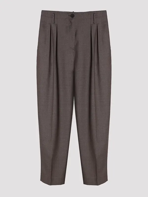 Брюки Erika Cavallini выполнены из 100% шерсти с подкладкой из ацетата и полиэстера, что придает им элегантную текстуру и комфорт. Коричневый цвет и классический крой с вертикальными складками создают строгий и современный силуэт, идеально подходящий для делового стиля. Простая отделка подчеркивает качество материала и внимание к деталям.