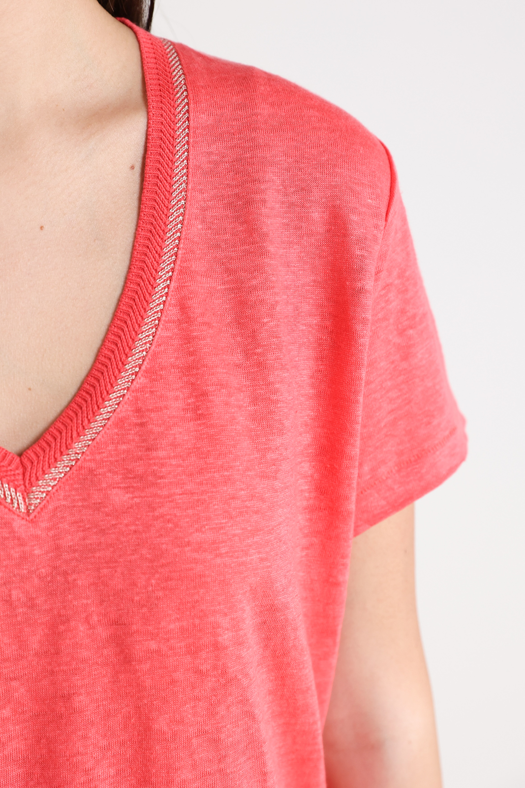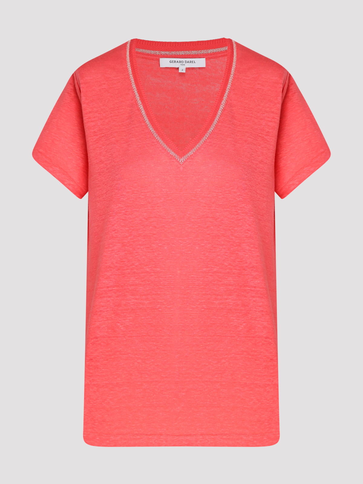 Футболка Gerard Darel выполнена из 100 % льна и представлена в нежно-розовом цвете. Её V-образный вырез украшен тонкой декоративной строчкой, придающей изделию элегантный штрих. Мягкая текстура натурального материала подчеркивает комфорт и женственность, а свободный крой создает современный и лаконичный силуэт.
