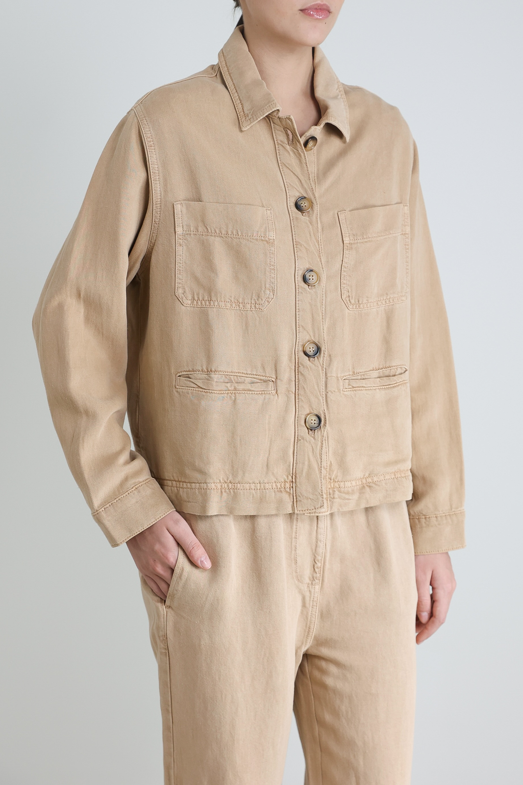 Жакет Gerard Darel, песочный цвет, 61% тенсел и 39% лен, создает элегантную фактуру с легкой текстурой. Стильный крой и силуэт обеспечивают универсальность в сочетании с трендом нейтральных оттенков. Декорированы простыми пуговицами и карманами, отделка на поясе добавляет функциональности и стилистической выразительности.