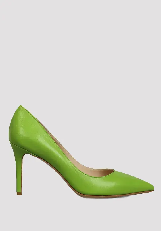 Туфли Gioia Dell'Acqua, цвет зеленый, выполнены из 100% кожи с гладкой фактурой. Элегантный крой с острым носком и высоким тонким каблуком подчеркивает лаконичный стиль. Подкладка и подошва также из натуральной кожи, обеспечивая комфорт и стилистическую целостность модели.