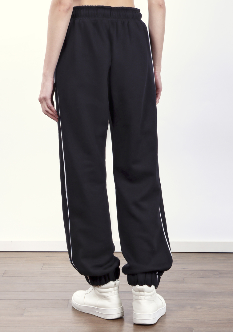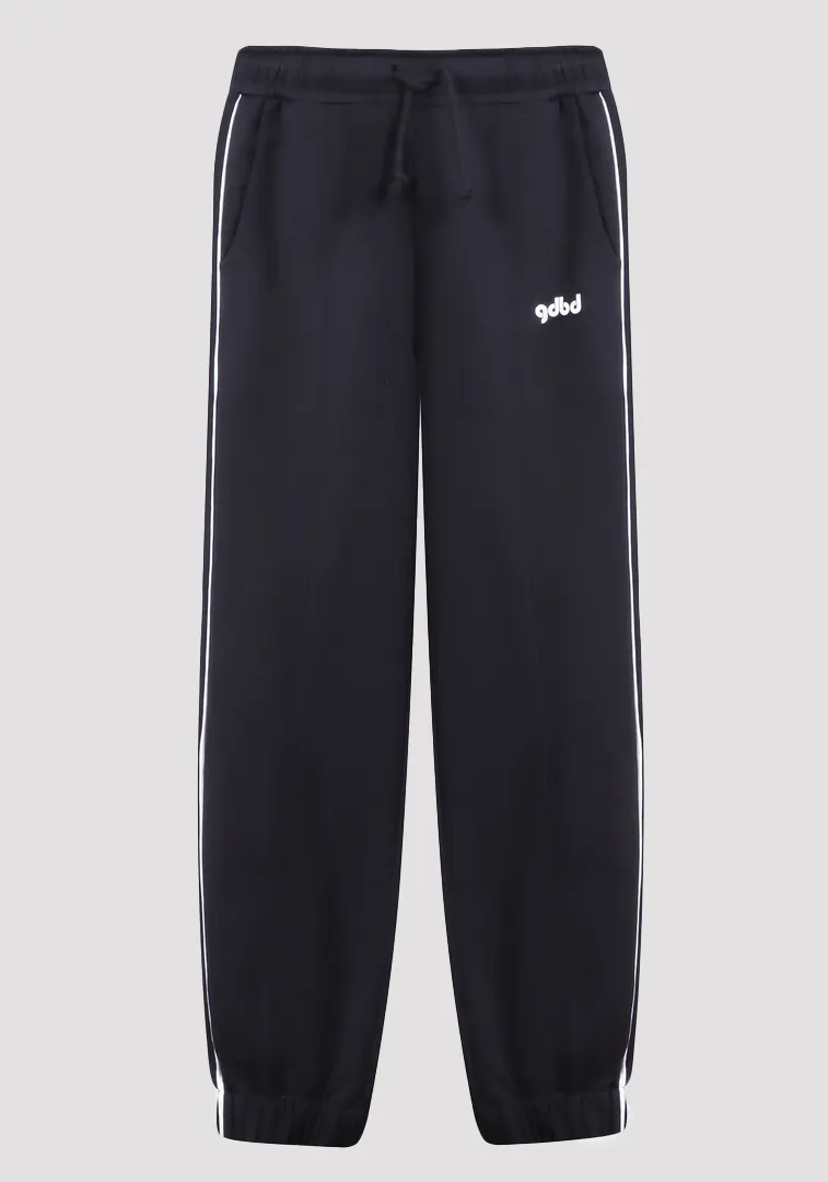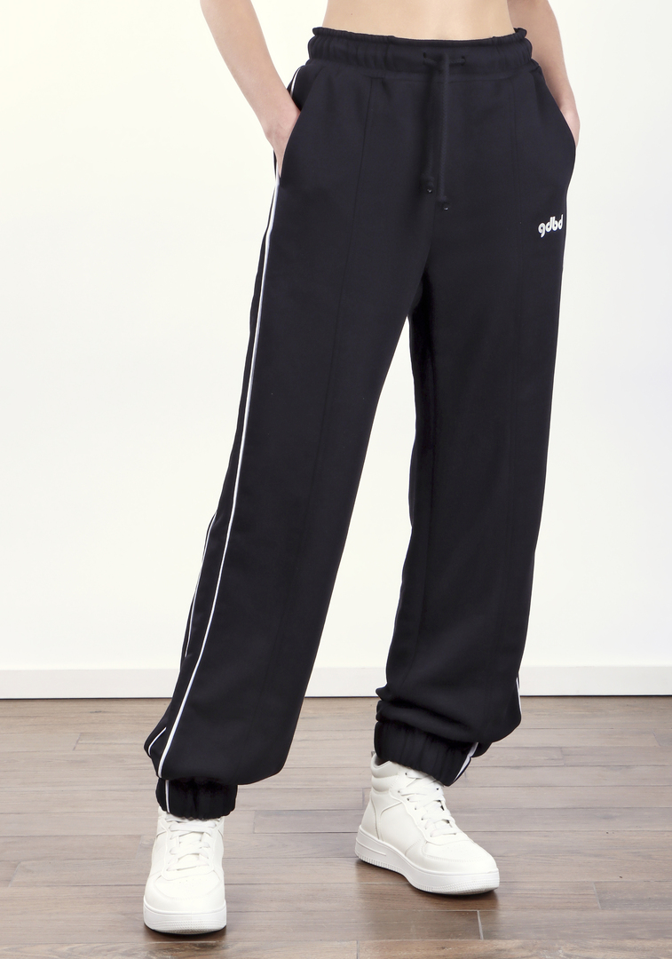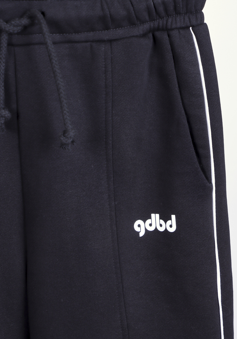 Брюки Good&Bad выполнены из мягкой смесовой ткани 85% хлопок, 15% полиэстер. Изделие черного цвета с контрастными белыми полосами по бокам и небольшим логотипом бренда на левом бедре. Крой прямой, комфортный, с эластичным поясом на шнурке и манжетами на щиколотках — идеальный выбор для повседневного стиля в духе уличной моды.