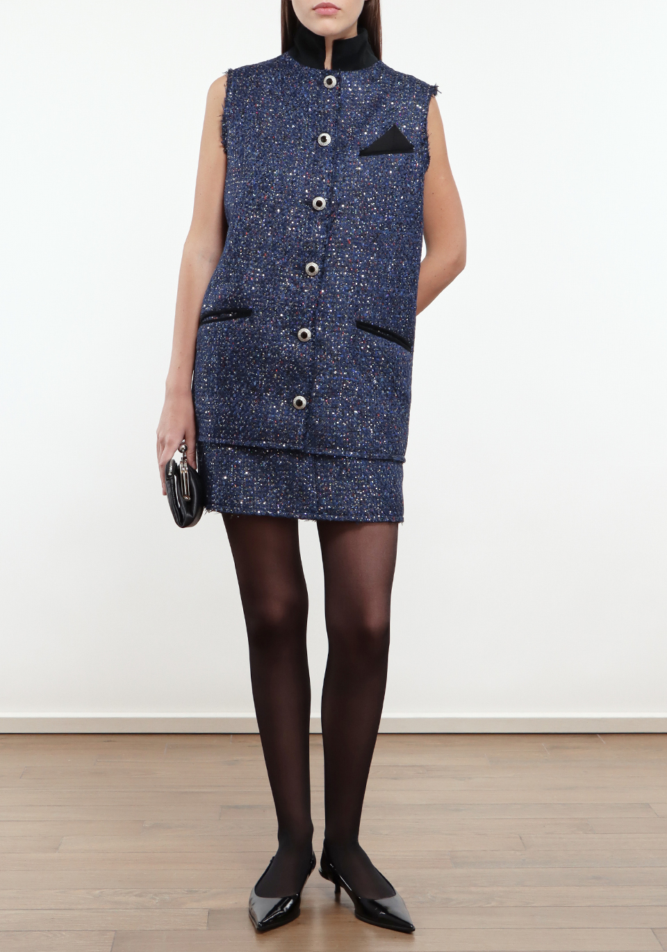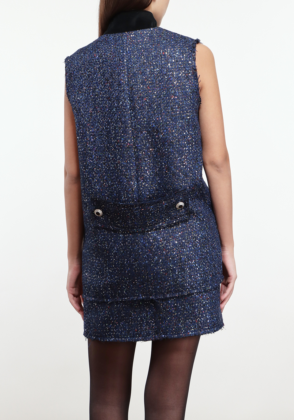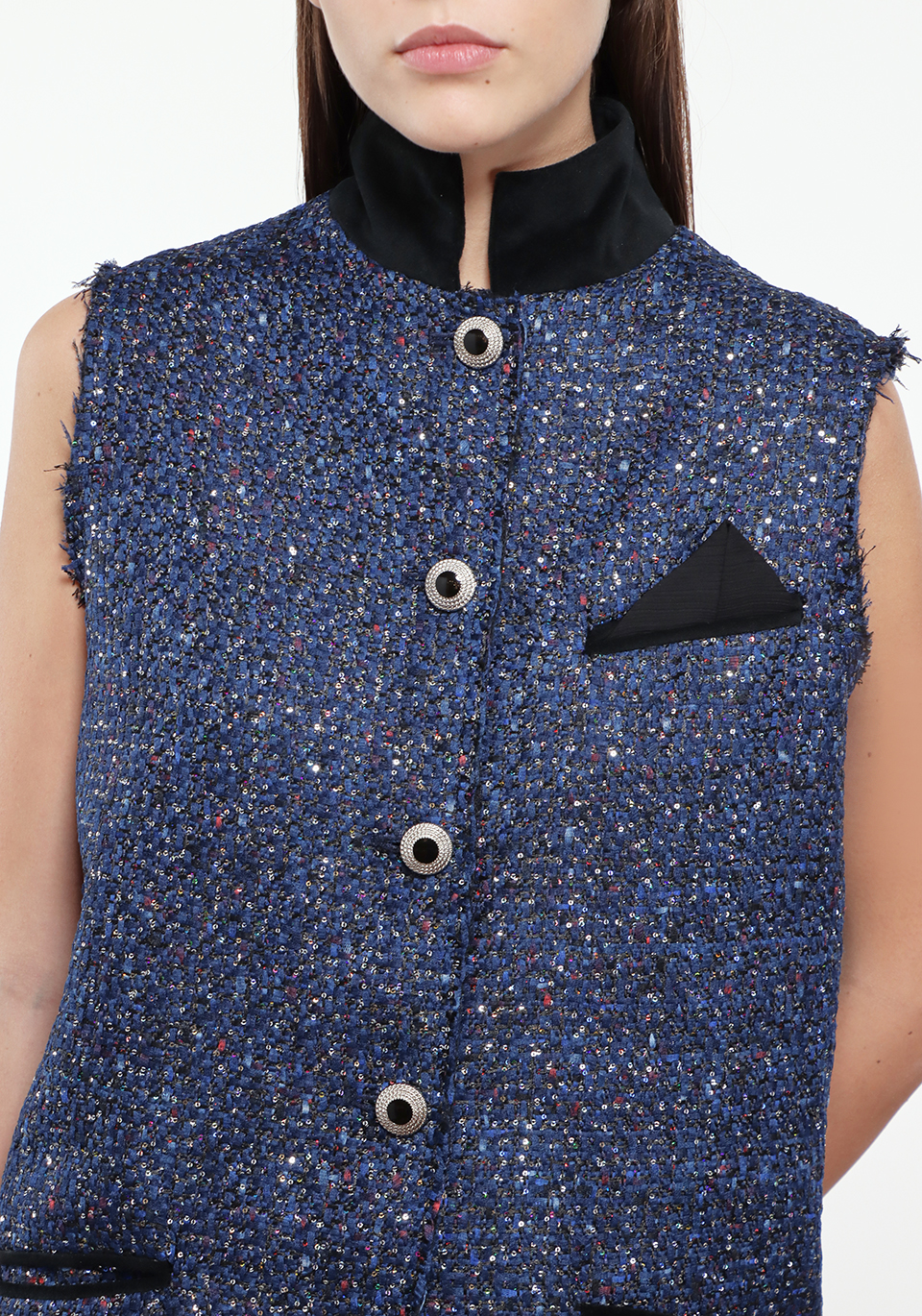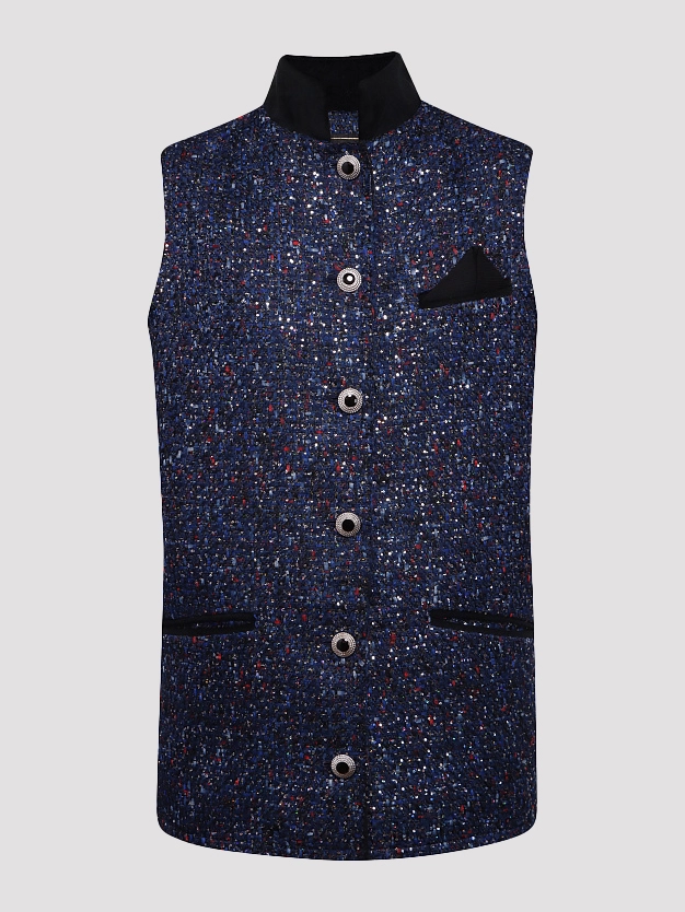 Жилет Les Archives, синий, 50% полиэстер, 20% акрил, 20% шерсть, 10% вискоза, текстура твидовая, фактура гладкая, стиль элегантный, тренд осенне-зимний, отделка контрастной черной подкладкой и карманами, декор вышитыми пуговицами, крой прямой, силуэт классический.