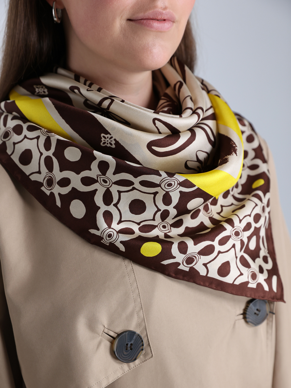 Платок Marina Rinaldi, выполненный из 100% шелка, представлен в коричневой палитре с изысканным цветочным узором. Тонкая текстура ткани подчеркивает элегантность и женственность, а декоративная кайма с геометрическим орнаментом добавляет шарма. Идеально сочетает классический стиль с современным трендом, дополняя образ сдержанной роскошью.