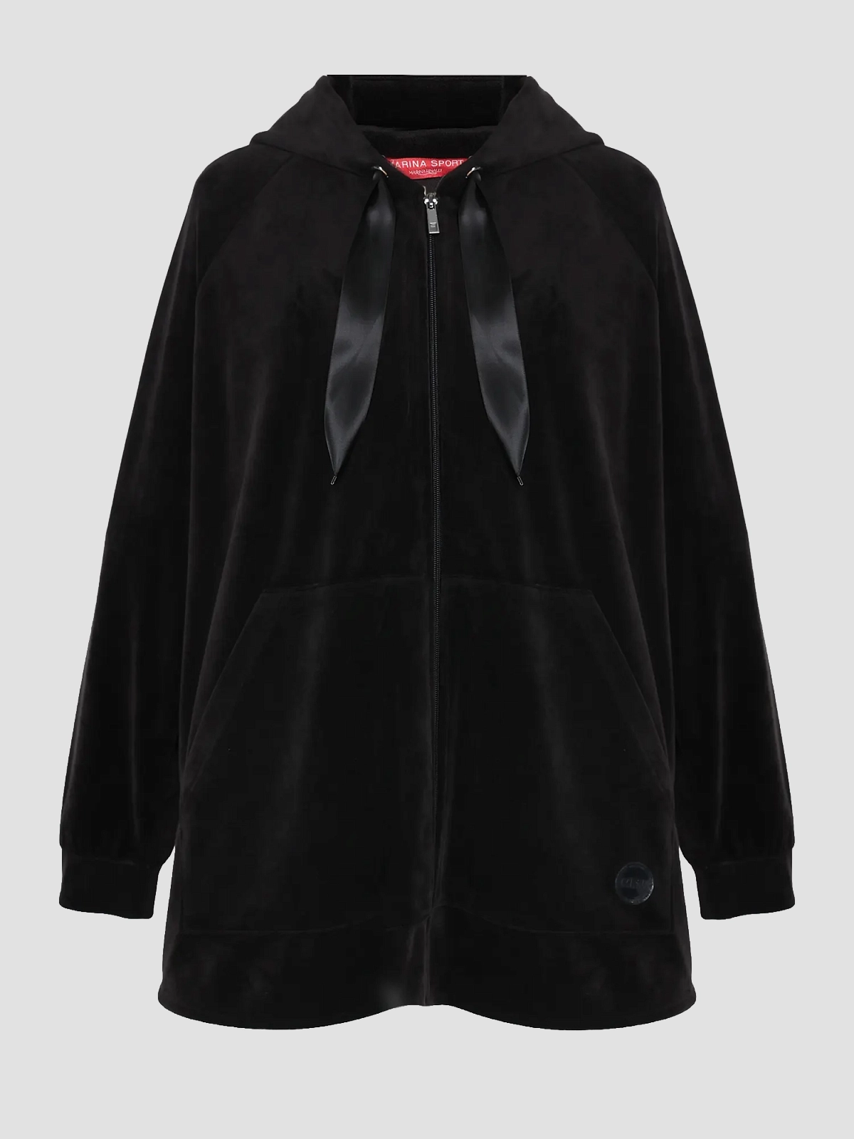 Толстовка спортивная Marina Rinaldi выполнена из мягкого черного велюра с добавлением эластана, что обеспечивает комфорт и эластичность. Модель с капюшоном и контрастной отделкой из глянцевой ткани на шнурке создает эффектный акцент. Прямой крой и два передних кармана придают изделию современный и элегантный вид, идеально подходящий для повседневного стиля.