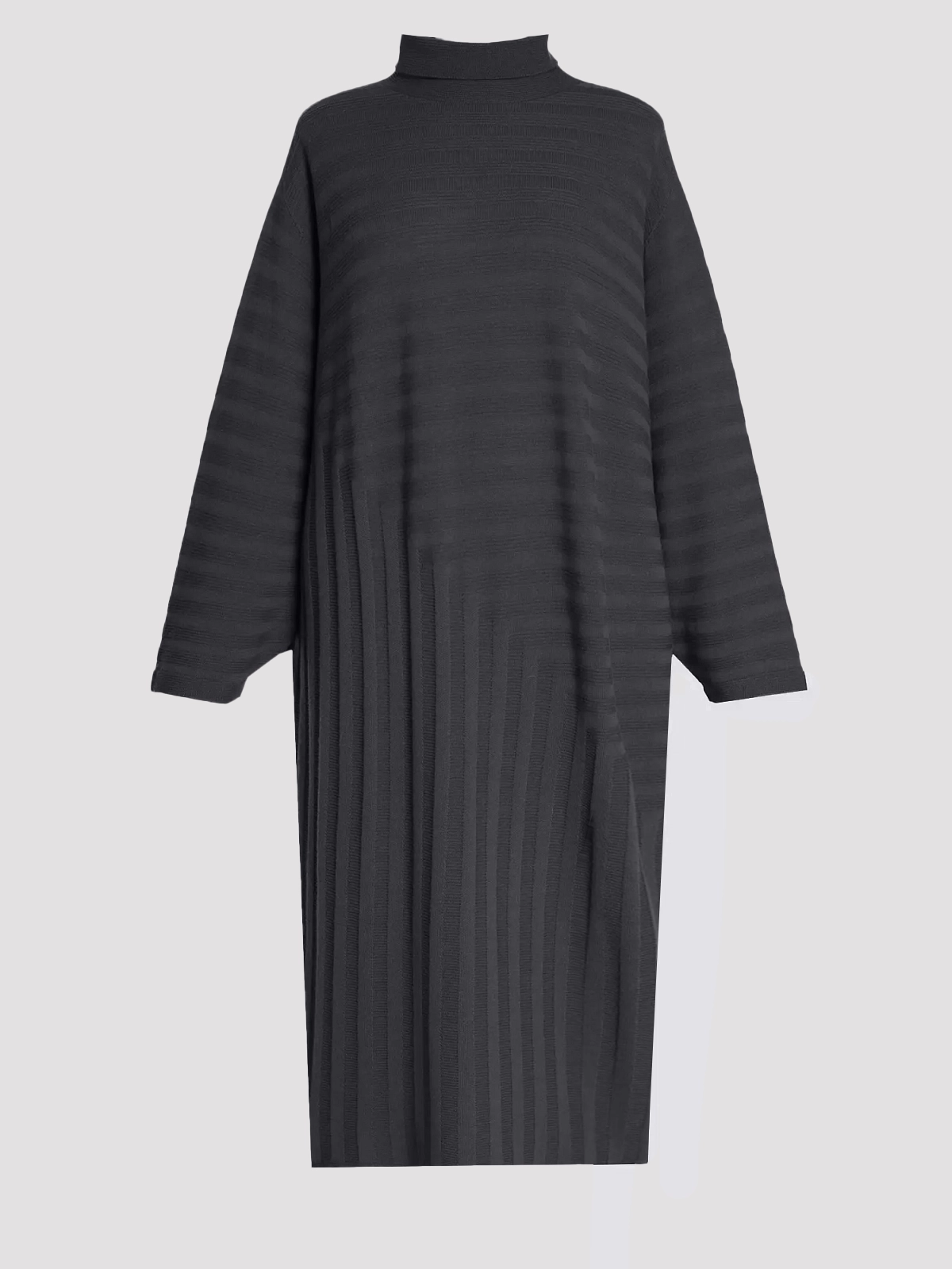 Платье трикотажное Marina Rinaldi выполнено из 100% шерсти и представлено в темно-сером цвете. Модель с высоким воротником и рукавами три четверти отличается объемным кроем и текстурной рельефной вязкой, создающей эффект глубины и утонченности. Элегантный силуэт подчеркивает женственность и современный стиль.