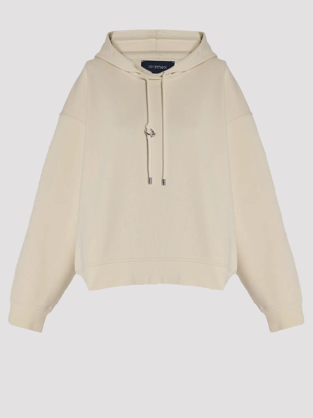 Толстовка спортивная Max Mara, молочного цвета, выполнена из 87% хлопка и 13% эластомультиэстера с подкладкой из 100% хлопка. Её текстура мягкая и комфортная, идеально подходит для создания лаконичного образа в стиле современного минимализма. Крой свободный, с капюшоном на завязках, обеспечивает максимальную гибкость и удобство при движении.