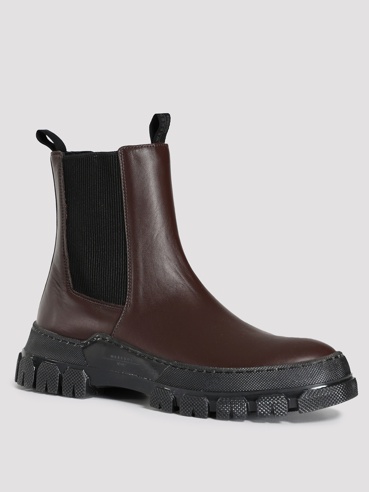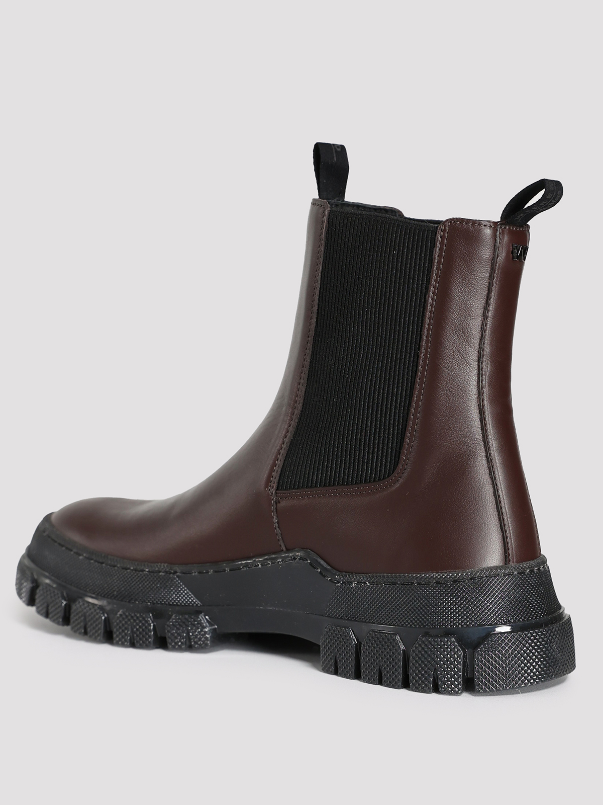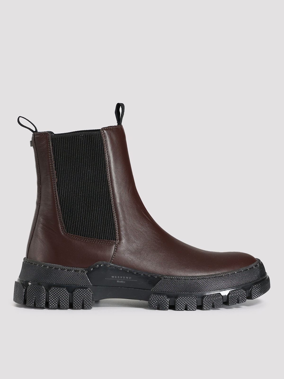 Ботинки Max Mara Weekend выполнены из гладкой темно-коричневой кожи, что придает им элегантный и сдержанный вид. Модель с эластичными вставками по бокам обеспечивает комфорт и удобство при носке. Подошва из резины с выраженным протектором подчеркивает современный тренд к практичности и стилю. Минималистичный дизайн дополнен аккуратной отделкой швов, создающей акцент на качественной текстуре материала. Силуэт прямой, классический — идеальный выбор для повседневного образа.