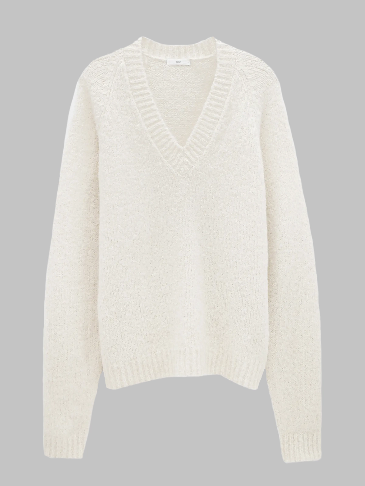Пуловер R2W, молочного цвета, выполнен из 90% альпаки и 10% полиамида, обеспечивая мягкость и комфорт. Тонкая вязка создает элегантную фактуру, подчеркивая лаконичный стиль. Классический V-образный вырез и свободный крой формируют современный силуэт, подходящий для любого случая.