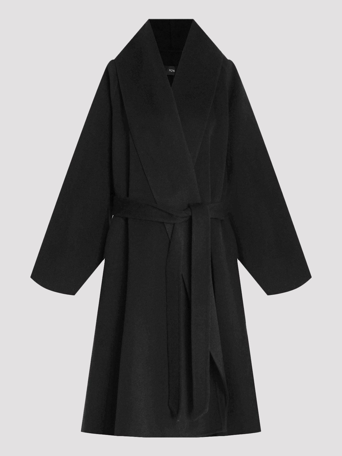Пальто R2W, черное, выполнено из шерсти и кашемира в превосходной фактуре. Элегантный силуэт с широким воротником и поясом подчеркивает лаконичный стиль. Подкладка из купро и полиэстера обеспечивает комфорт и тепло.