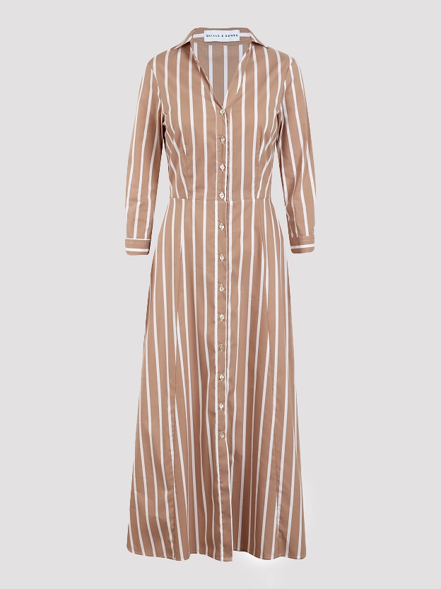 Платье Skills&Genes, бежево-белый цвет, 68% хлопок, 30% полиамид, 2% эластан. Лаконичное платье-рубашка с длинными рукавами и отложным воротником, декорированное белыми вертикальными полосами. Крой прямой, подчеркивающий элегантность и универсальность. Ткань гладкая, приятная на ощупь, создает легкий и воздушный образ.