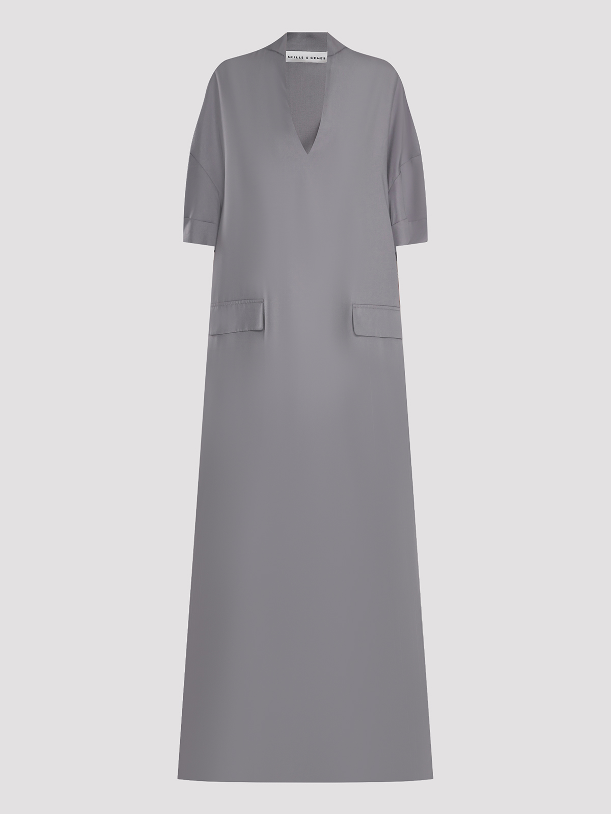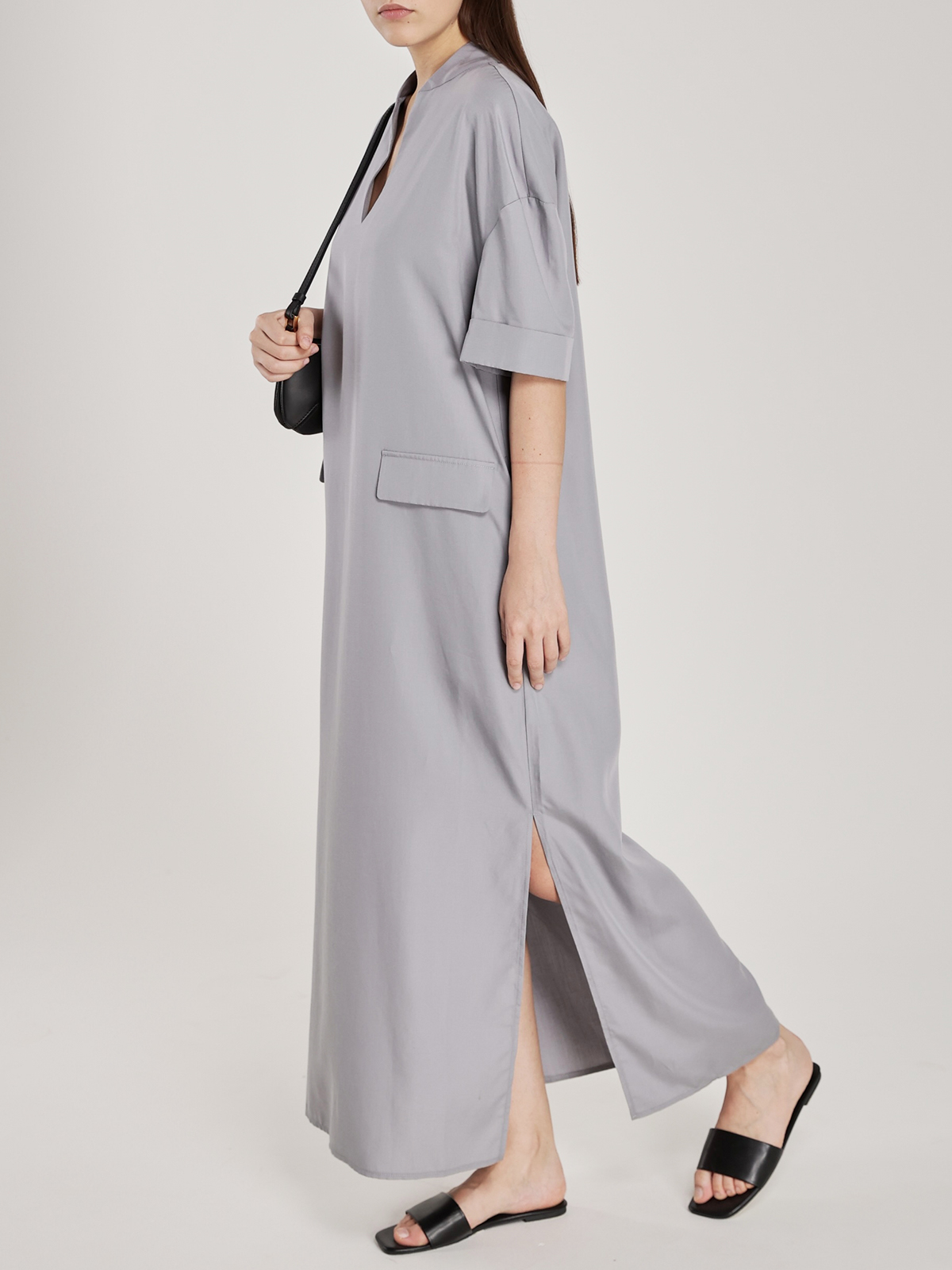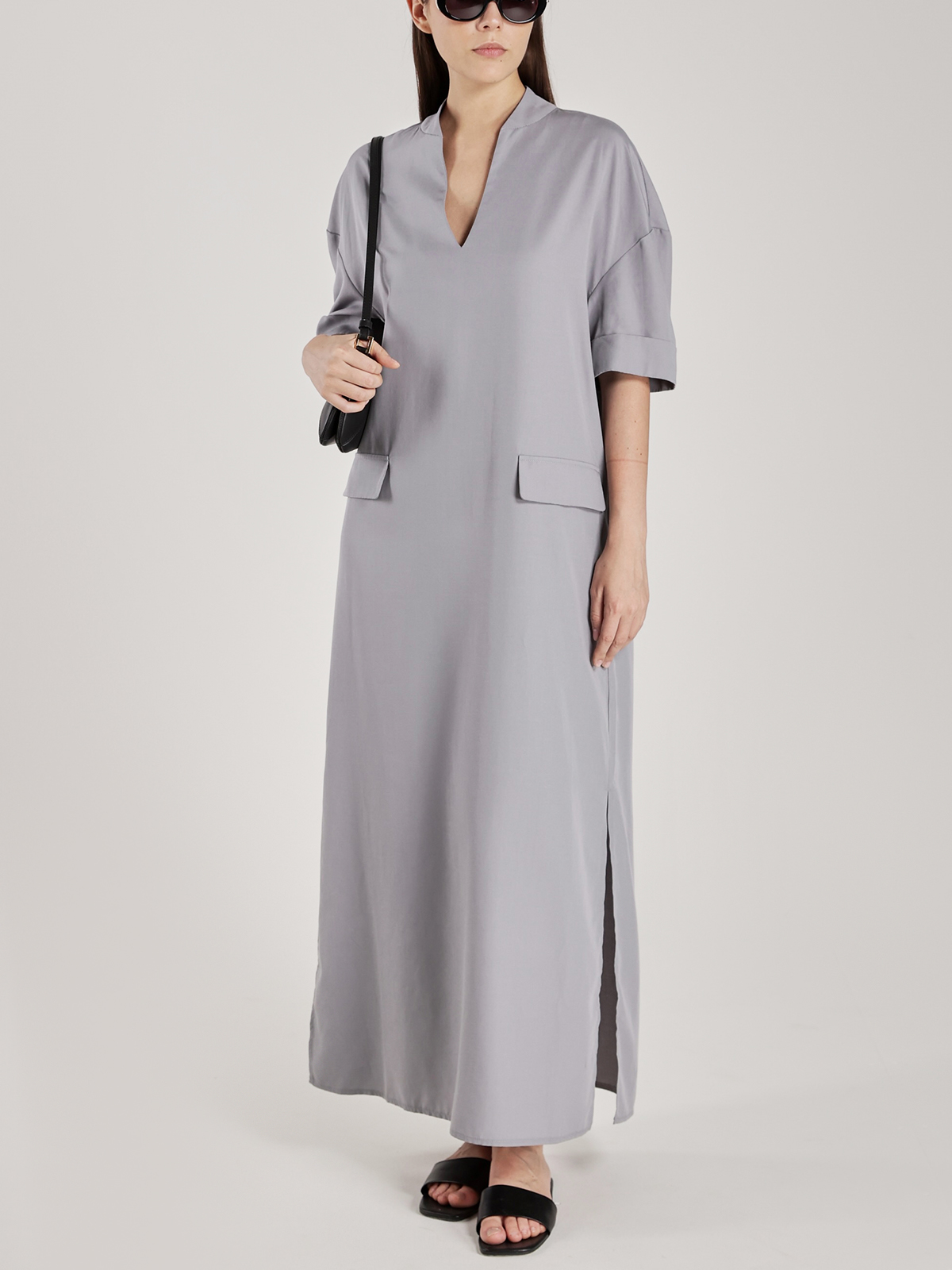 Платье Skills&Genes в сером цвете, выполненное из смеси 92% тенсела и 8% льна, обладает нежной текстурой и элегантным силуэтом. Модель с V-образным вырезом и короткими рукавами дополнена двумя функциональными карманами на передней части. Легкий крой подчеркивает современный минималистичный стиль, идеально подходящий для повседневной носки или деловых встреч.