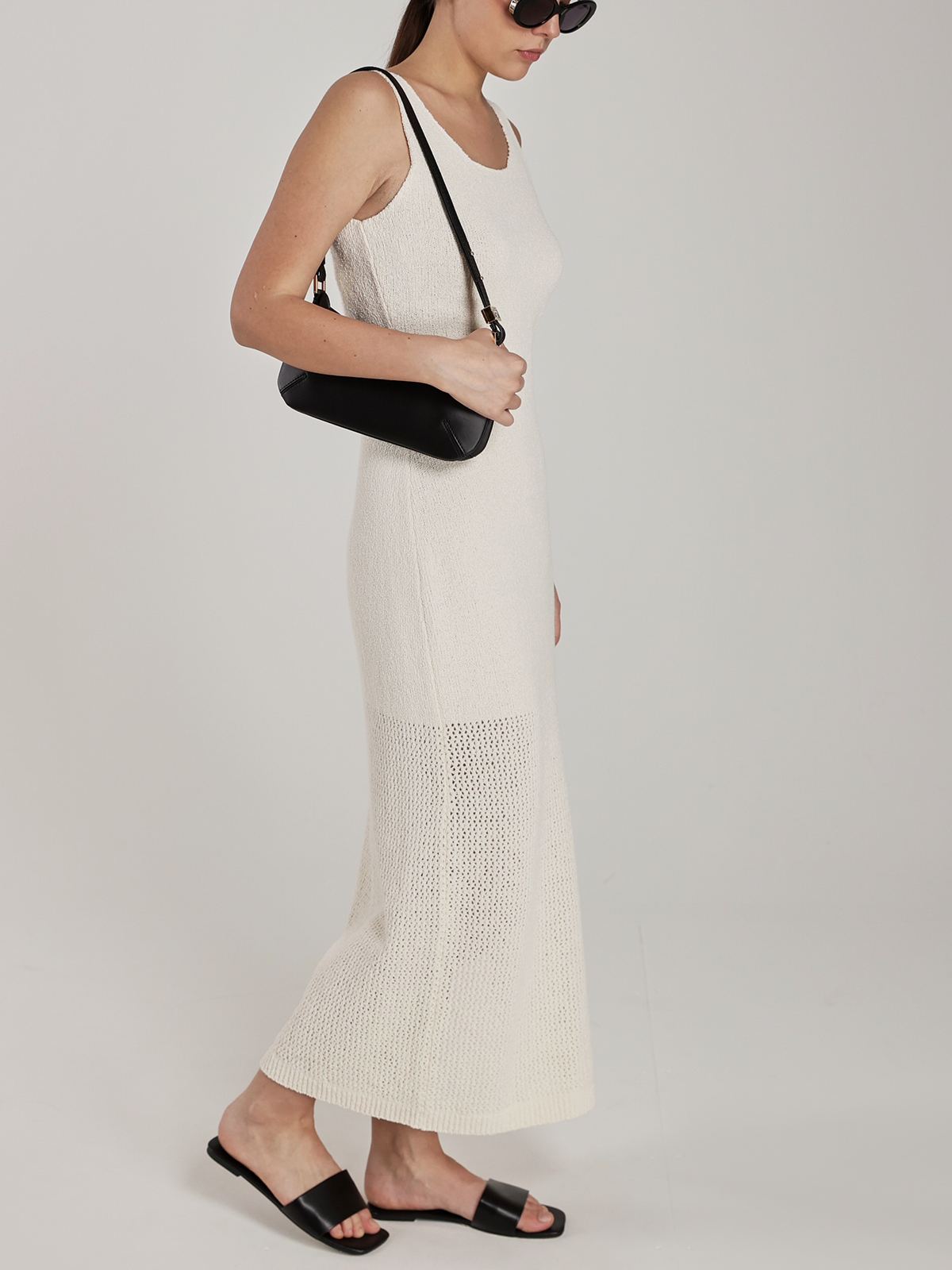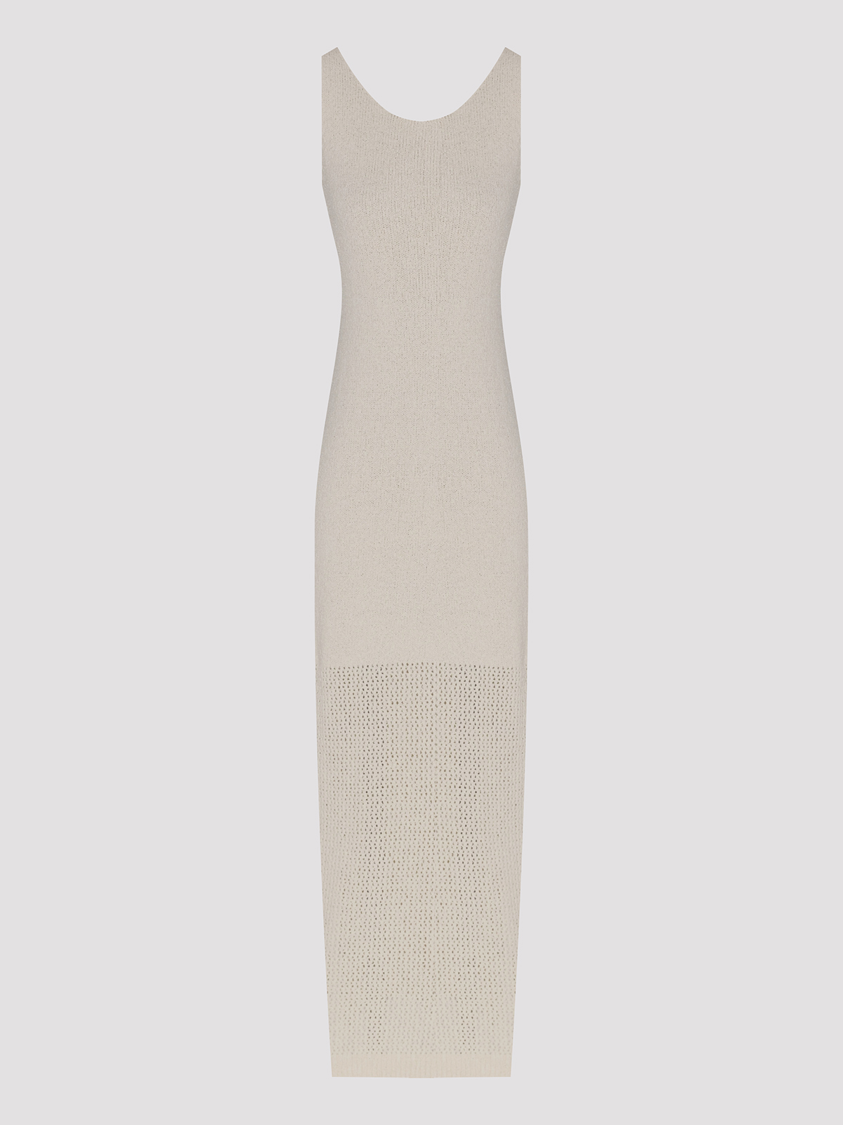 Платье Skills&Genes в молочном цвете выполнено из смеси хлопка, полиэстера и полиамида, что придает ему мягкую текстуру и комфорт. Силуэт приталенный, без рукавов, с округлым вырезом, подчеркивающий элегантность. Нижняя часть платья украшена тонкой фактурной вязкой, добавляющей изысканности. Идеально подходит для создания образов в минималистичном стиле.