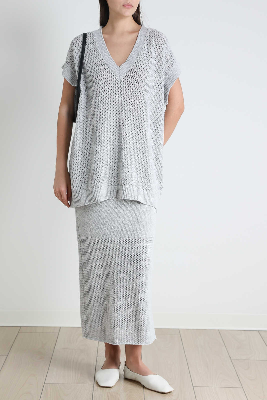 Джемпер Skills&Genes, серый цвет, 70% хлопок, 17% полиэстер, 13% полиамид, создает легкую и элегантную фактуру. Тонкая вязка придает изделию нежную текстуру, подчеркивая его роскошный стиль. Современный крой с V-образным вырезом и короткими рукавами формирует стройный силуэт, актуальный для текущих трендов осени. Декорирован отделкой из тонкой ленты на горловине, добавляющей изысканности.