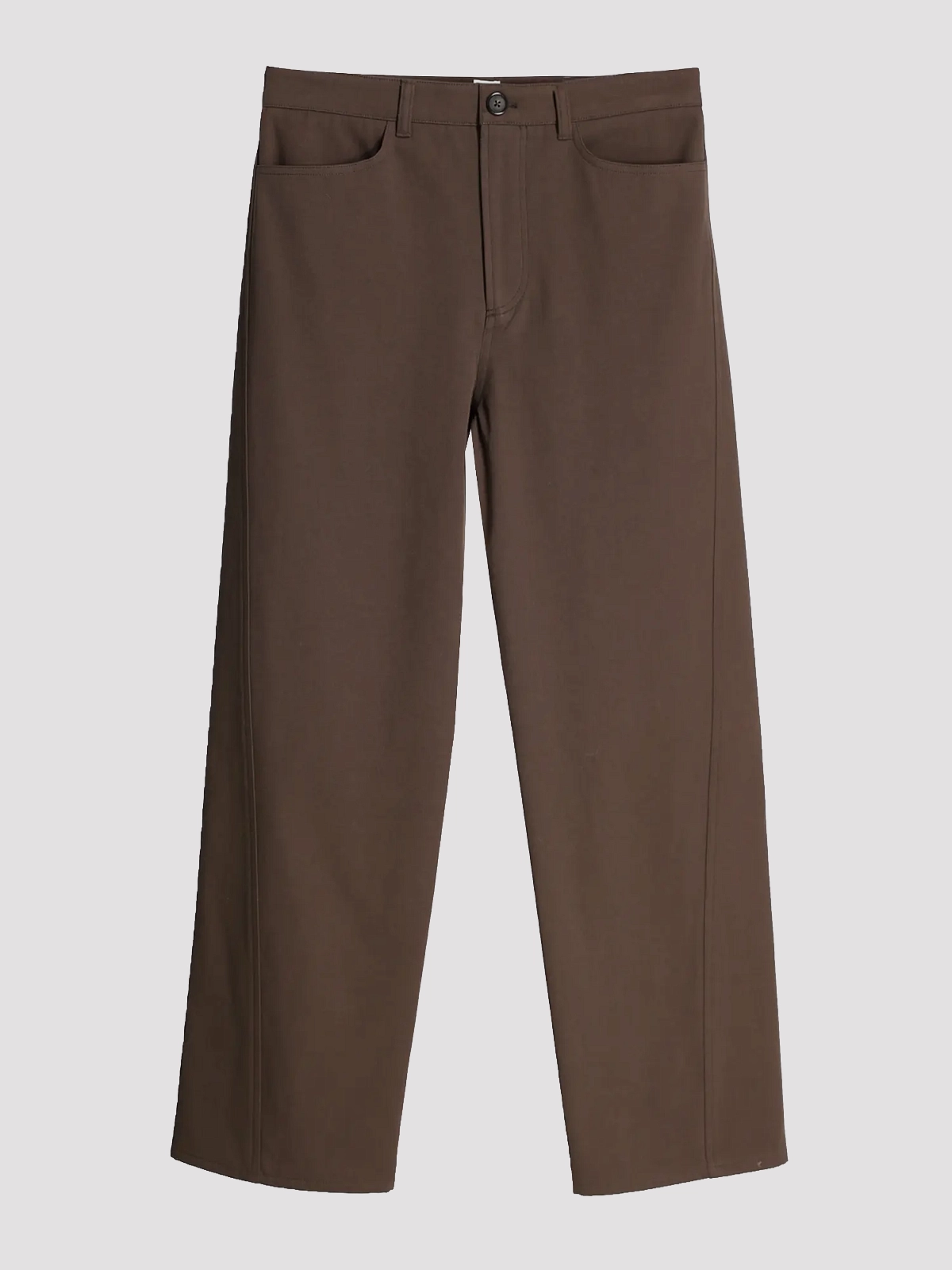 Брюки Toteme выполнены из 100% хлопка и представлены в темно-коричневом цвете. Изделие отличается элегантным кроем с прямым силуэтом, подчеркивающим современный минималистичный стиль. Гладкая текстура ткани придает брюкам мягкость и комфорт, а классические детали — такие как передние накладные карманы — добавляют практичности и завершенности образа.