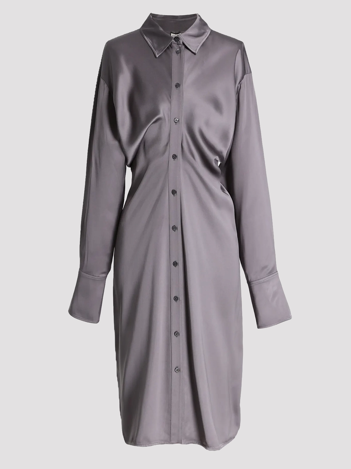 Платье от Toteme выполнено из гладкой вискозы темно-серого цвета. Стильный силуэт с классическим воротником и длинными рукавами подчеркивает элегантность. Асимметричные складки на лифе добавляют объема и динамики, создавая современный и минималистичный образ. Простая застежка на пуговицы завершает лаконичный дизайн.