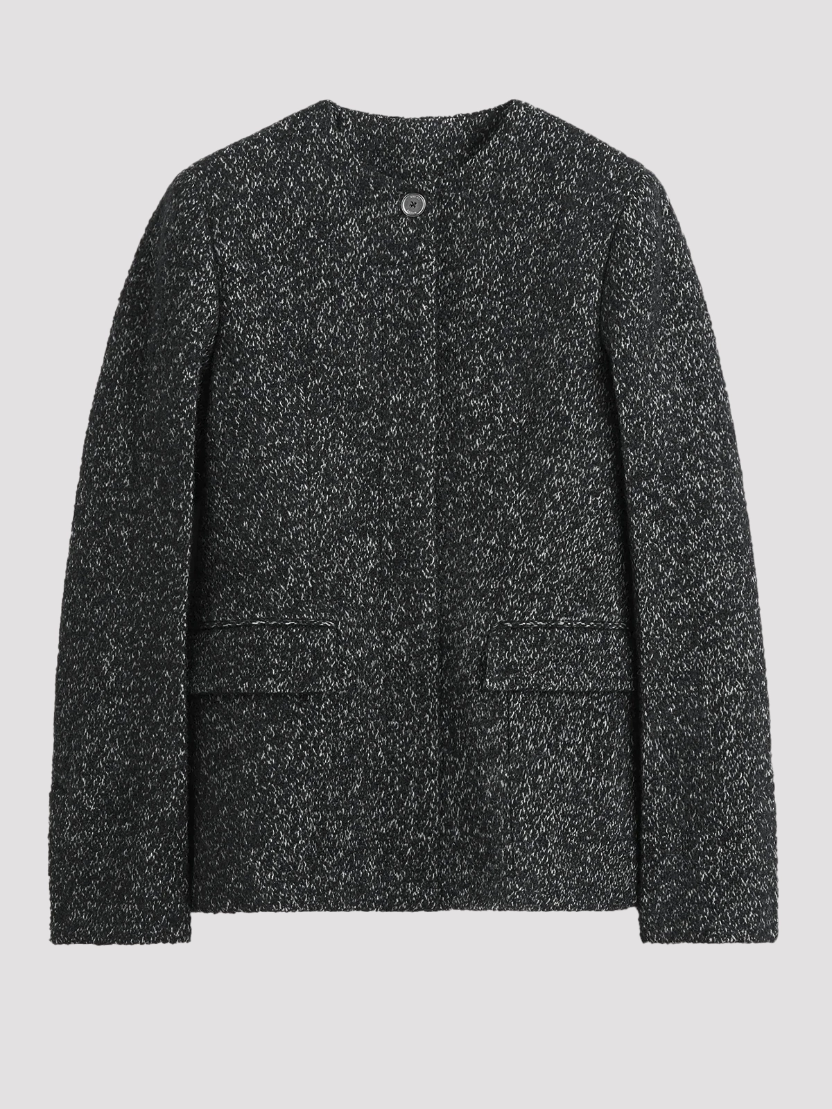 Жакет Toteme в черном цвете, выполненный из смеси 74% шерсти, 20% полиэстера и 6% полиамида, обладает текстурной фактурой с легким блеском. Стильный крой с круглым вырезом и небольшой пуговицей на груди подчеркивает элегантность и современность. Декоративные карманы добавляют практичности и завершенности образа.