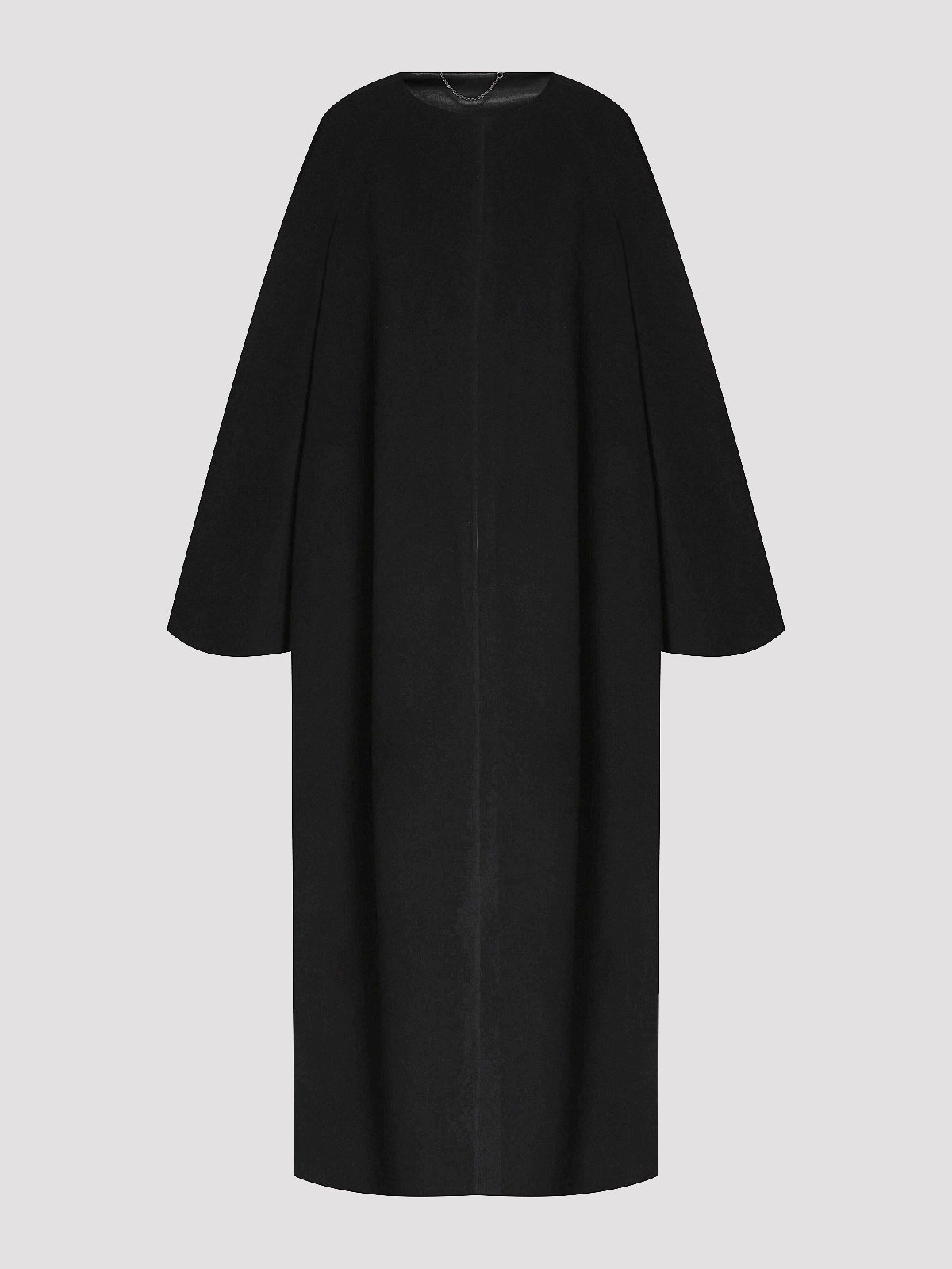 Пальто Toteme в классическом черном цвете, выполненное из смеси 70% шерсти, 25% полиамида и 5% кашемира, обладает нежной текстурой и элегантным силуэтом свободного кроя. Модель с длинными рукавами и округлым вырезом подчеркивает современный минималистичный стиль, идеально подходящий для повседневной носки или деловых встреч.