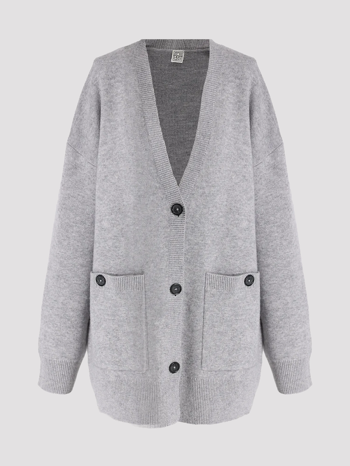 Кардиган Toteme в сером цвете, выполненный из смеси 52% шерсти, 44% кашемира и 4% полиамида, обладает нежной текстурой и свободным силуэтом. Модель с V-образным вырезом и двумя карманами на пуговицах подчеркивает минималистичный стиль и современные тенденции.