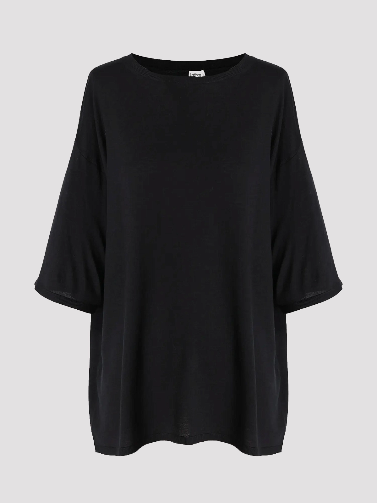 Футболка Toteme черного цвета, выполненная из смеси 60% шерсти и 40% ацетата, обладает нежной текстурой и элегантным силуэтом с рукавами три четверти. Модель подчеркивает современный минималистичный стиль, дополнена аккуратной отделкой по краям рукавов.