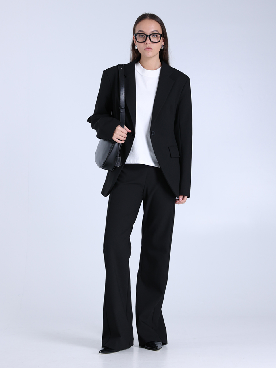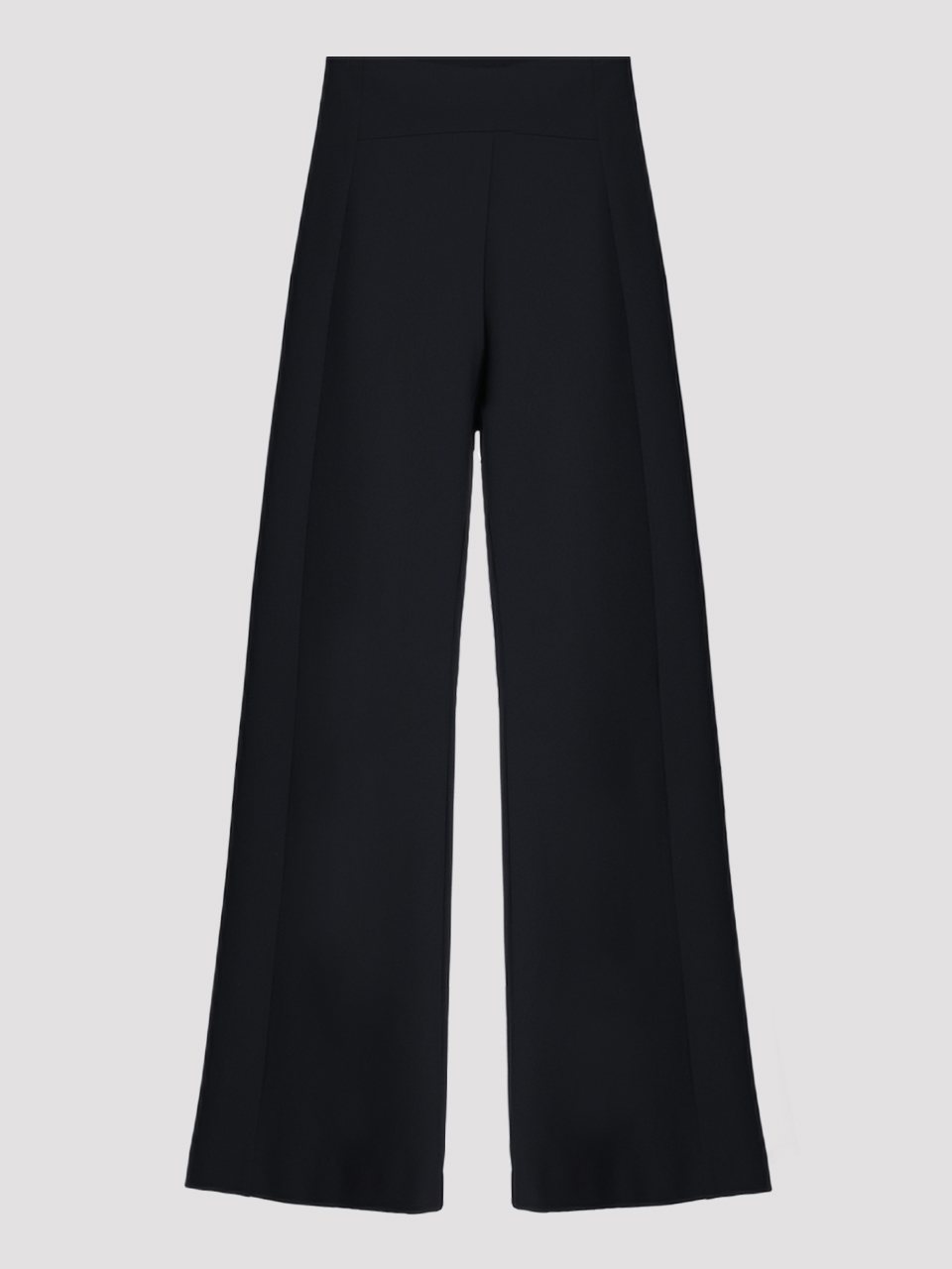 Брюки Totti Store выполнены из смесовой ткани черного цвета, состоящей из 64% полиэстера, 34% вискозы и 2% эластана. Изделие отличается элегантным кроем с широкими штанинами и высокой посадкой, создающей строгий и современный силуэт. Текстура материала гладкая и приятная на ощупь, что подчеркивает их универсальность и комфорт. Благодаря качественному составу, брюки сохраняют форму и идеально сидят, делая их идеальным выбором для создания стильных образов в деловом или повседневном стиле.