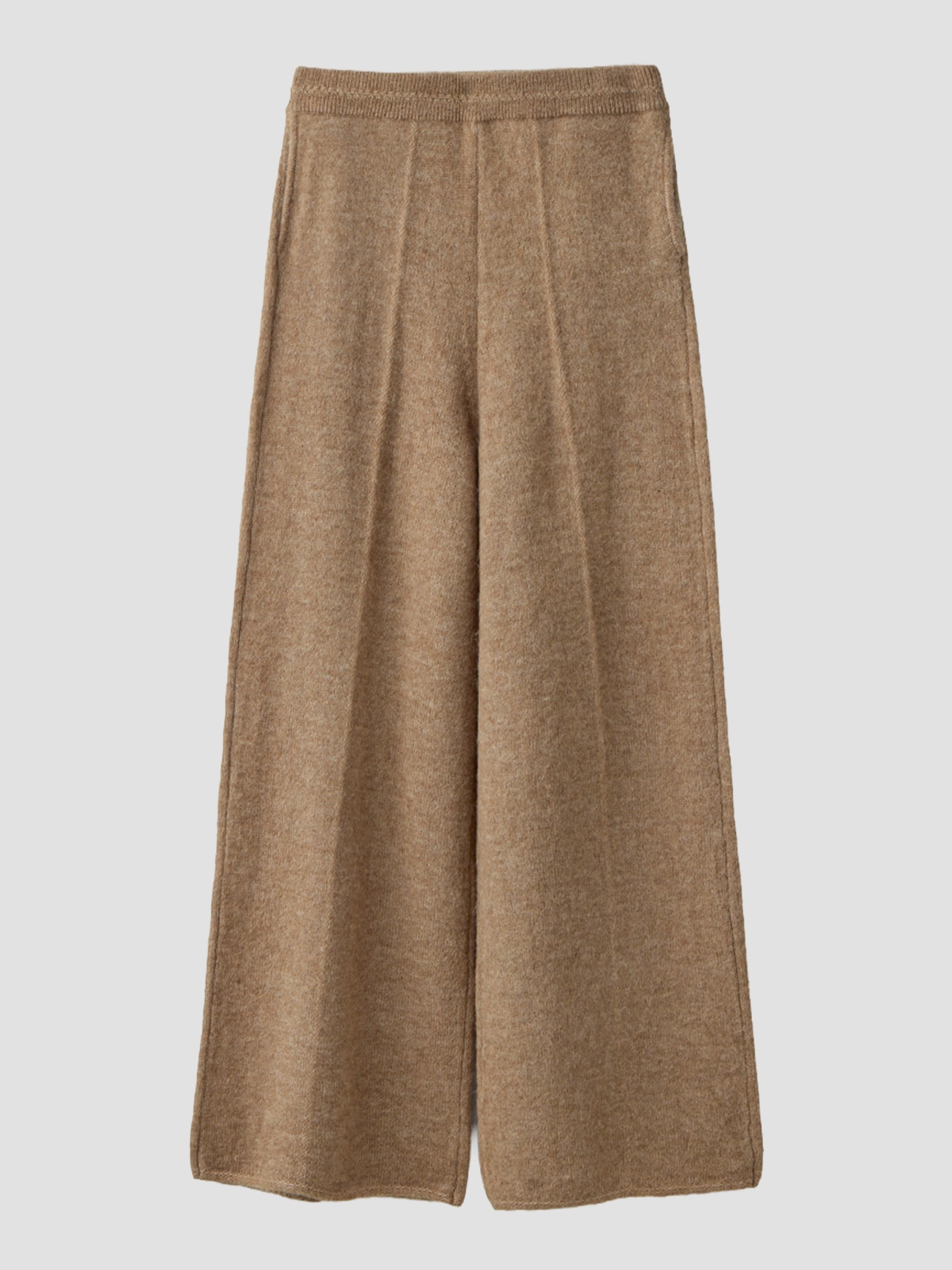 Брюки трикотажные Umarmung в бежевом цвете, выполненные из смеси 60% альпаки, 35% нейлона и 5% шерсти, обладают нежной текстурой и элегантным силуэтом. Изделие дополнено вертикальными складками, придающими объем и женственность, что делает его идеальным выбором для создания современного и утонченного образа.