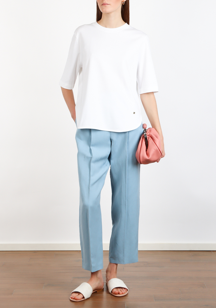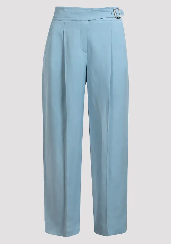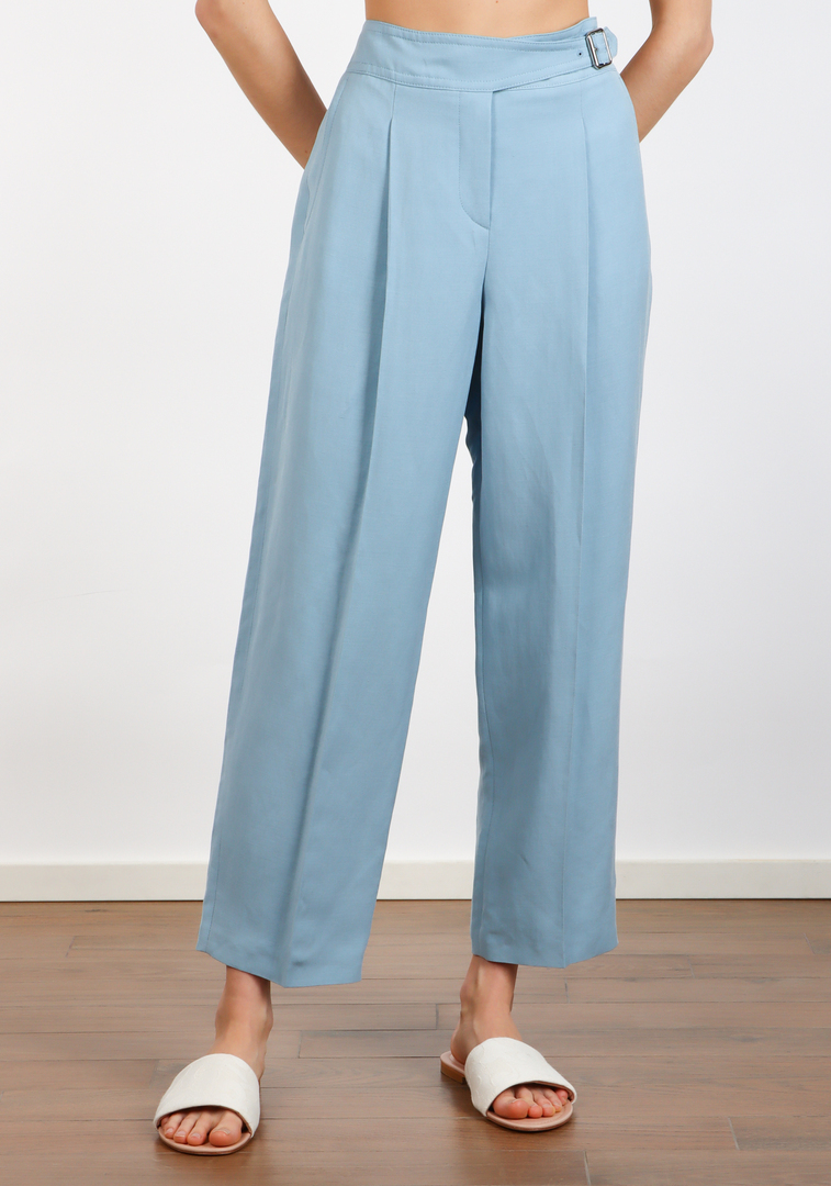 Брюки Windsor, цвет голубой, 75% вискоза и 25% лен, создают элегантную фактуру. Лаконичный крой с высокой талией и прямыми штанинами подчеркивает современный тренд минимализма. Декорированы металлической пряжкой на поясе, добавляющей нотку стиля.