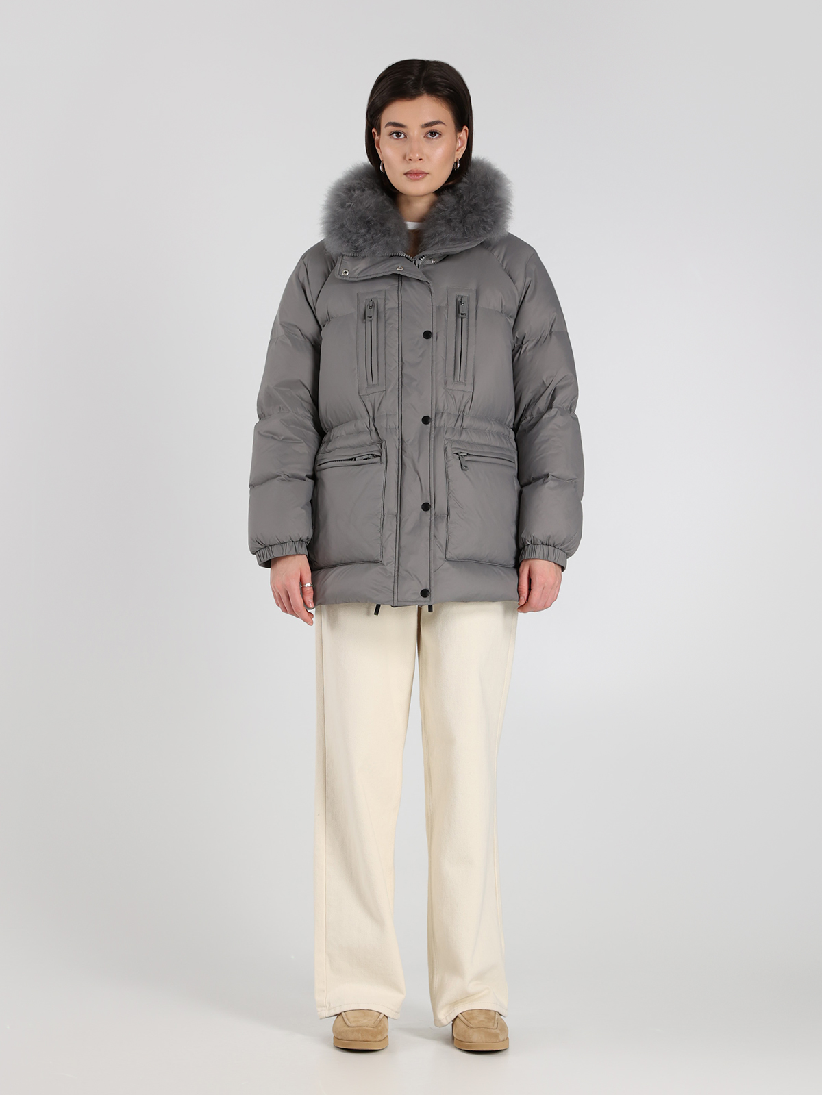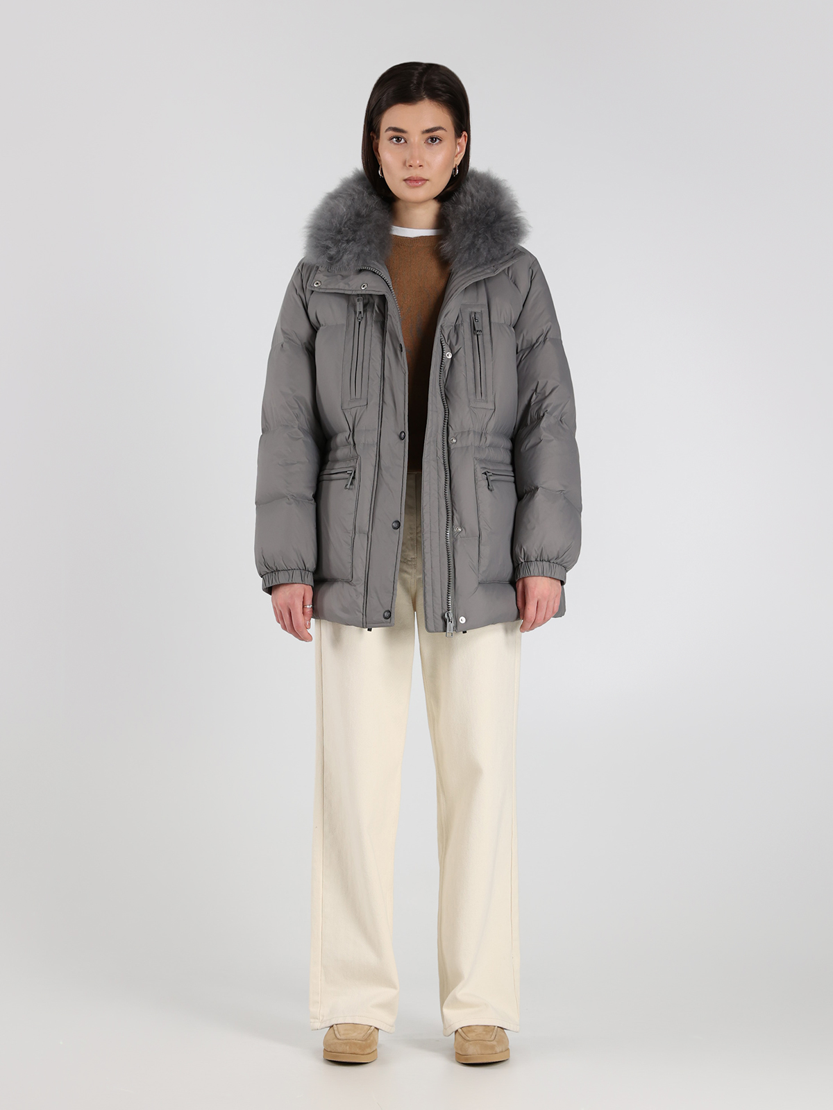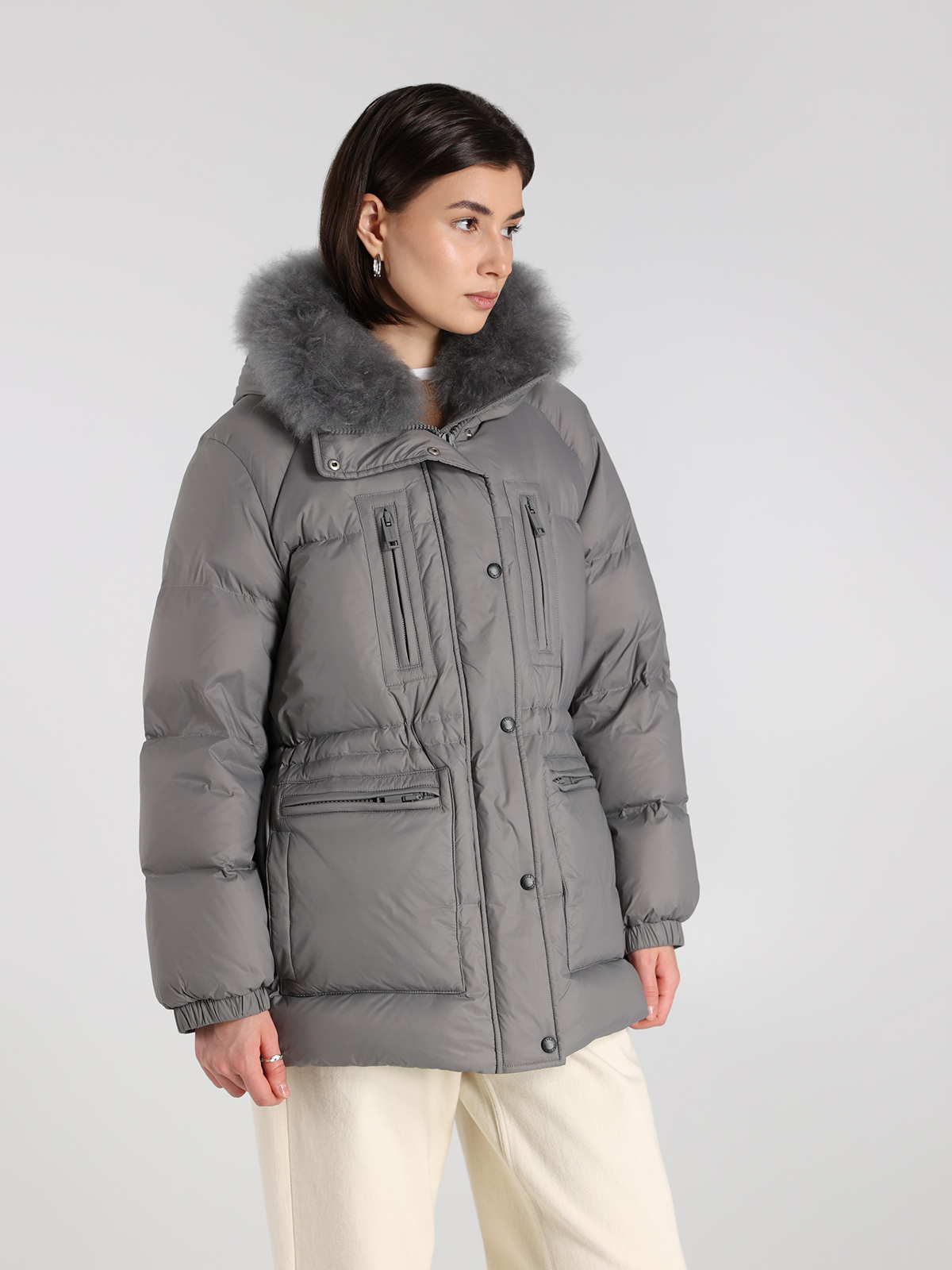 Пуховик Yves Salomon в сером цвете — воплощение элегантности и комфорта. Изготовлен из 100% полиамида с пышным воротником из натуральной овчины, он сочетает в себе мягкость и тепло благодаря наполнителю из 95% пуха и 5% пера. Классический крой с функциональными карманами подчеркивает современный стиль, а текстура ткани придает изделию легкую роскошь. Идеальный выбор для тех, кто ценит качество и изысканный дизайн.